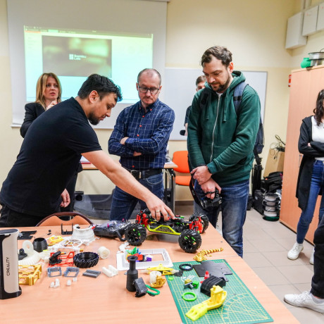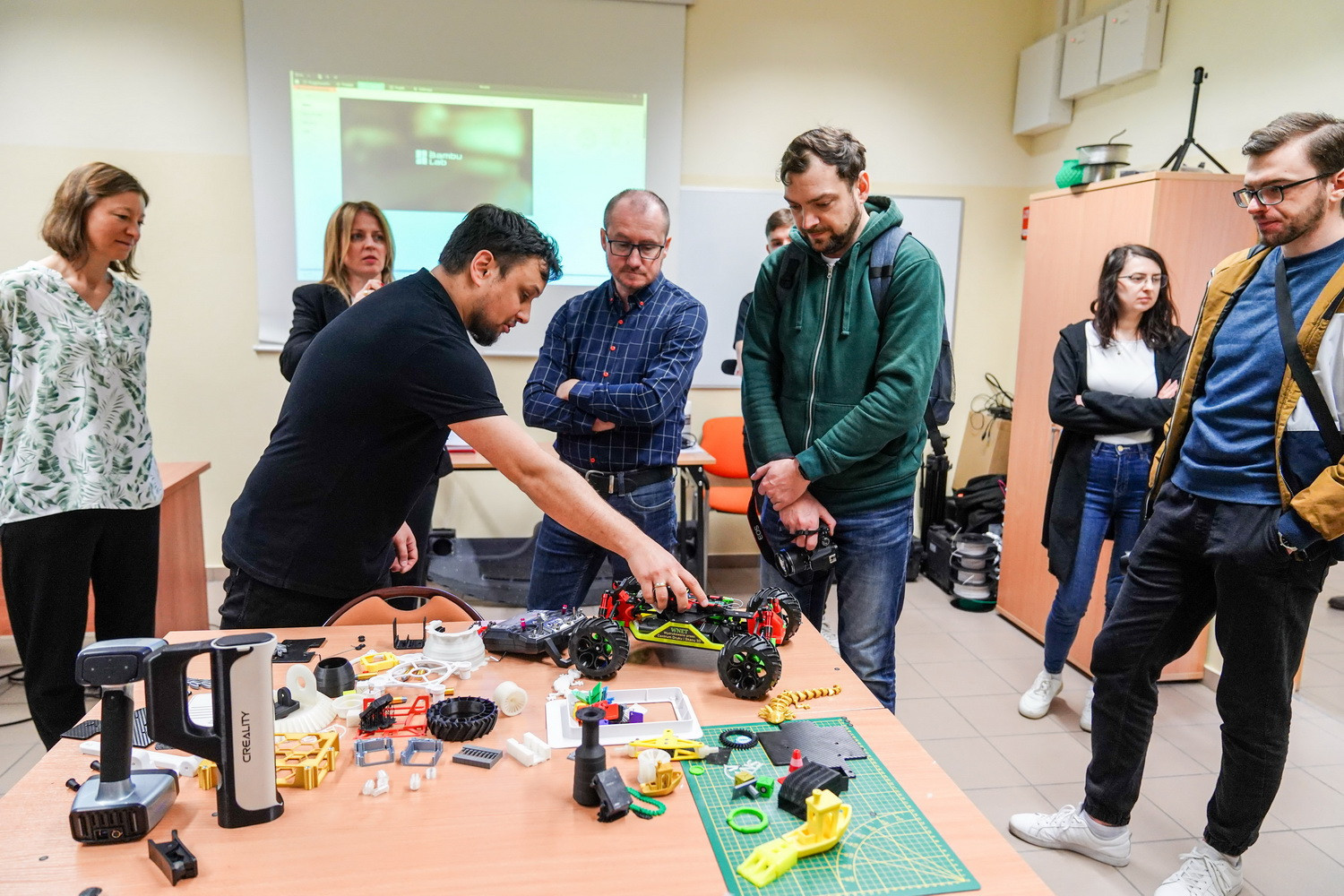 W trakcie ich zwiedzania przedstawiono nie tylko wyposażenie i warunki, ale również metody nauczania, które pozwalają studentom zdobywać praktyczne umiejętności tak niezbędne na współczesnym rynku pracy. Uczestnikom zaproponowano też osobiste przetestowanie sprzętu, czyli wejście w skórę studentów, by mogli choć w części poznać specyfikę nauki w nowoczesnych laboratoriach i pracowniach. I w tej sytuacji oczywiście rodziły się pytania, a to o możliwości maszyny do czyszczenia filtrów DPF (są w silnikach wysokoprężnych), a to o potencjał drukowania złotem w technologii 3D, np. biżuterii. A kto pyta, ten się dowiaduje: drukowanie złotem na naszej uczelni nie jest możliwe ¯\_(ツ)_/¯