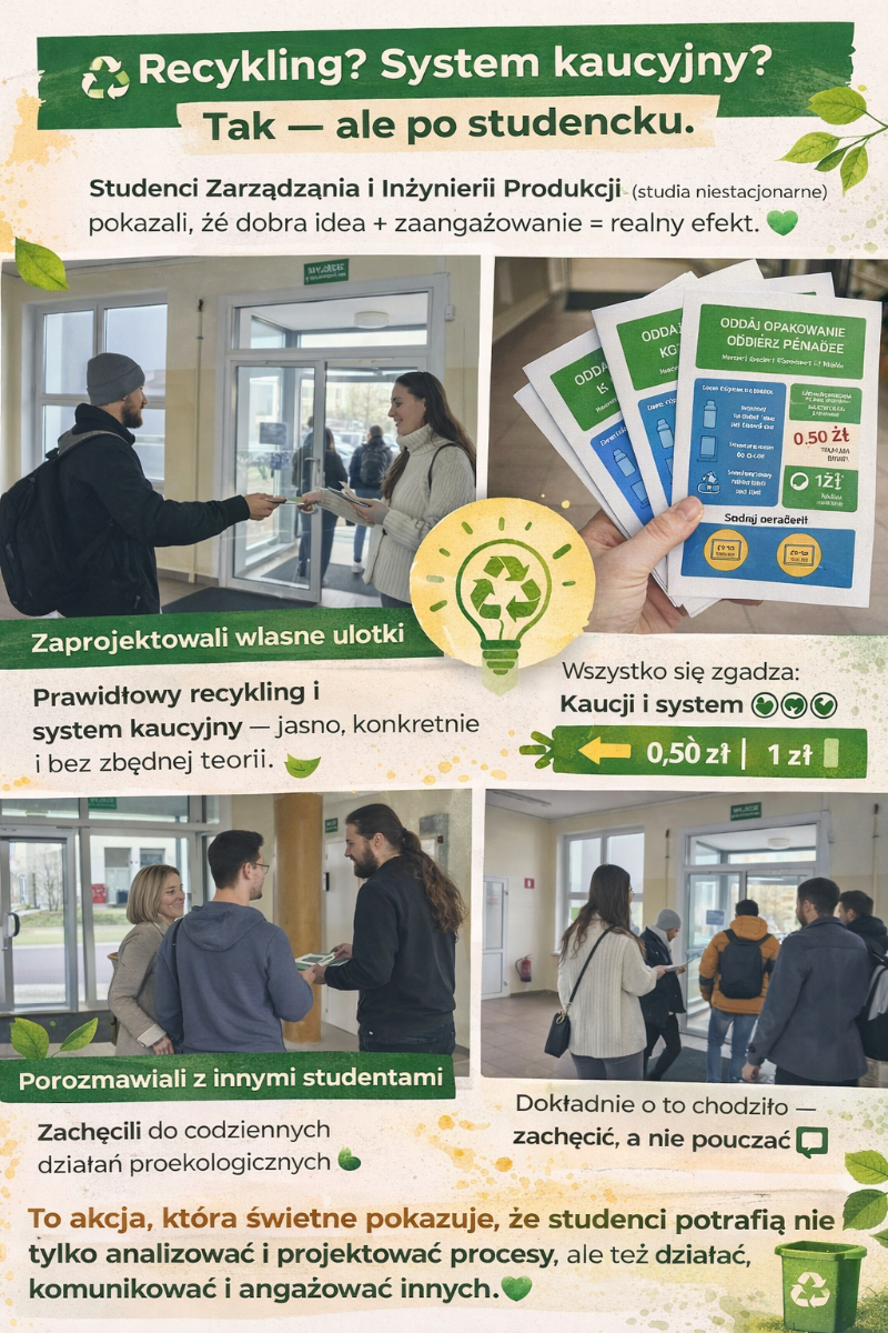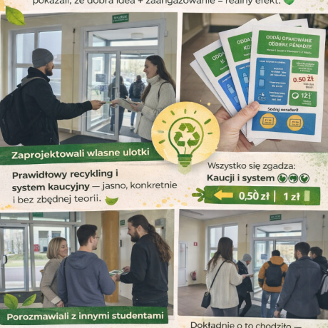 Wszystko w ramach przedmiotu zarządzanie środowiskiem i ekologia u dr inż. Moniki Muszyńskiej. Podczas zajęć zaprojektowali własne ulotki, przygotowali treści i wyszli z nimi na teren uczelni. Tematyka? Oszczędzanie wody i system kaucyjny, jasno, konkretnie i bez zbędnej teorii.