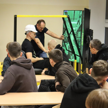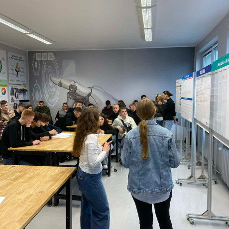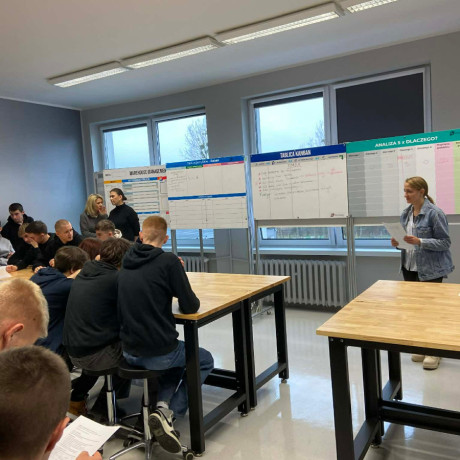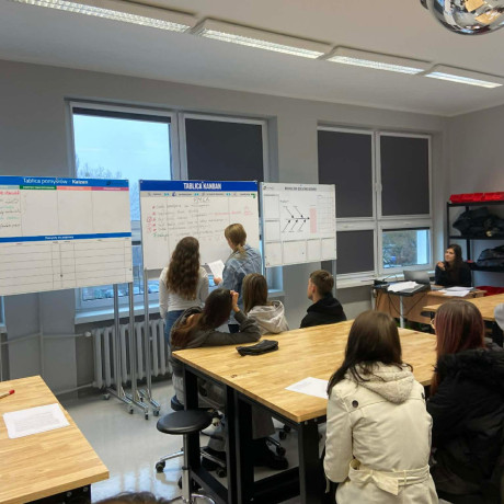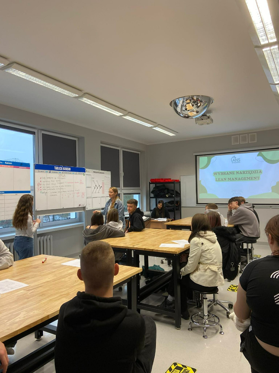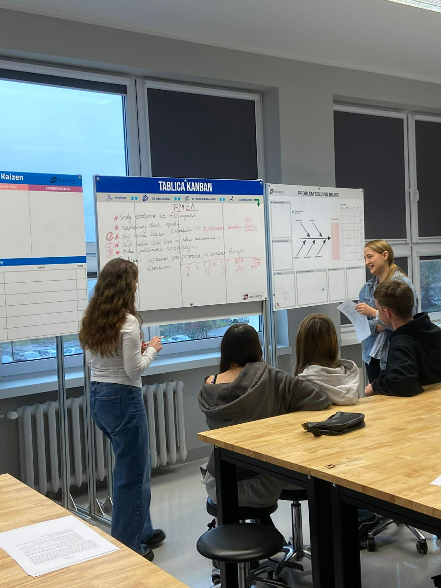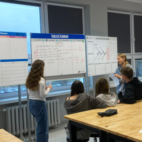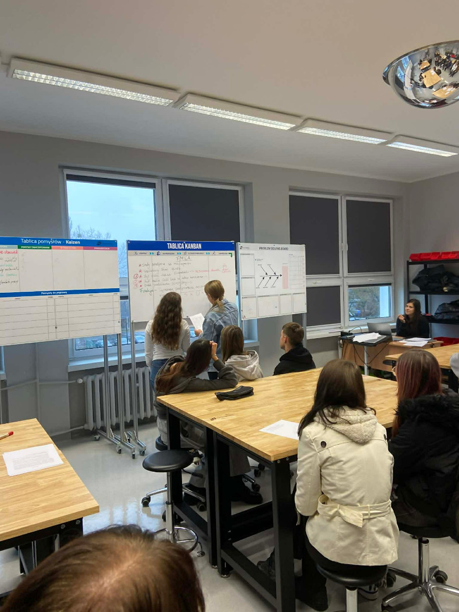 Zajęcia z obsługi wózka widłowego przygotował mgr Błażej Kuras, który wprowadził uczniów w zasady bezpiecznej pracy w magazynie oraz zapoznał z podstawami obsługi urządzeń transportu wewnętrznego. Każdy uczestnik mógł samodzielnie zasiąść za sterami symulatora i przenieść się do wirtualnego magazynu, aby sprawdzić swoje umiejętności w realistycznych warunkach. Z kolei warsztaty z lean manufacturing przeprowadziły studentki zarządzania i inżynierii produkcji, które pokazały, w jaki sposób stosować zasady optymalizacji procesów, eliminacji marnotrawstwa oraz poprawy efektywności pracy. Uczestnicy wzięli też udział w ćwiczeniach, które ilustrowały wpływ usprawnień na działanie magazynu i produkcji.