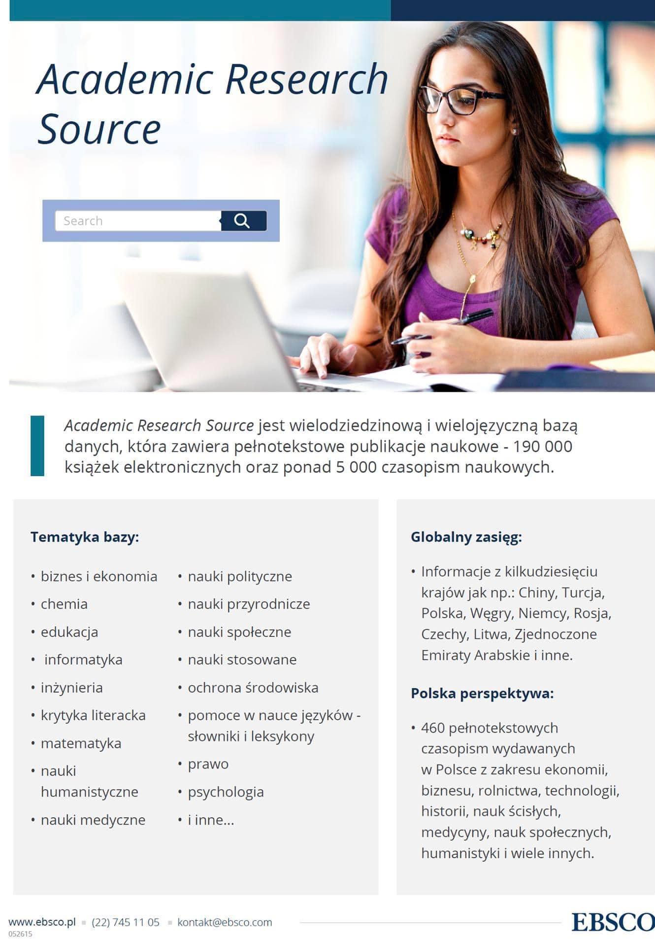 Jedną z baz jest multidyscyplinarna baza EBSCO Academic Research Source, która oferuje dostęp do ponad 190 000 książek elektronicznych oraz 5 ...Czytaj więcejPrzejdź do pełnej zawartości artykułu: EBSCO Academic Research Source