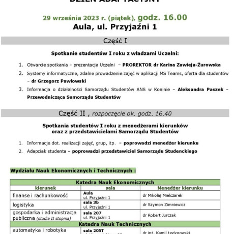 Zapraszamy wszystkich nowo przyjętych studentów do udziału w Dniu Adaptacyjnym, który odbędzie się w najbliższy piątek, tj. 29 września 2023 r. o godz. 16:00.