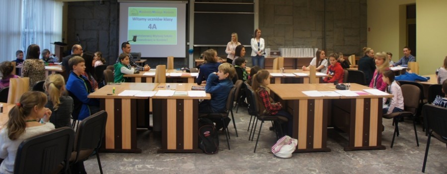 Młodych studentów odwiedził także prof. Mirosław Pawlak, rektor PWSZ w Koninie, który wręczył im certyfikaty ukończenia zajęć oraz słodkie upominki mikołajkowe. Dzieci miały okazję zobaczyć rektora w pełnym „umundurowaniu”: w todze i z berłem. Zasypały go szeregiem pytań, czasami zaskakujących. Chciały wiedzieć, jakie przedmioty lubił, kiedy był dziesięciolatkiem (okazało się, że historię i język polski), jakie ma hobby i co go poza pracą interesuje. Pytały również, jak duża jest uczelnia, jakie są najpopularniejsze kierunki oraz czy łatwo być rektorem i rządzić „taką dużą szkołą”, a także o najlepszy sposób nauczenia się języka angielskiego.
