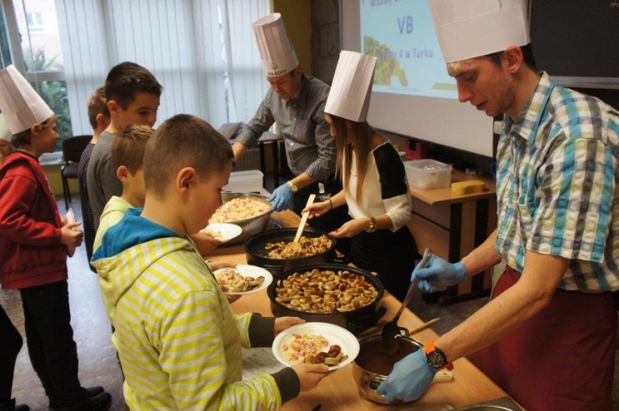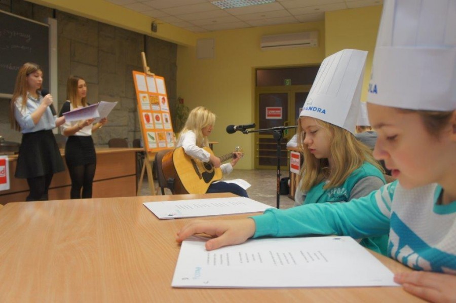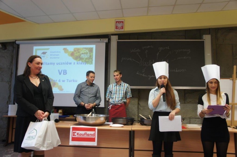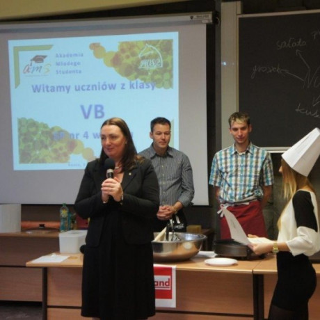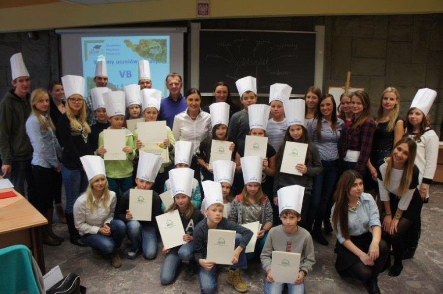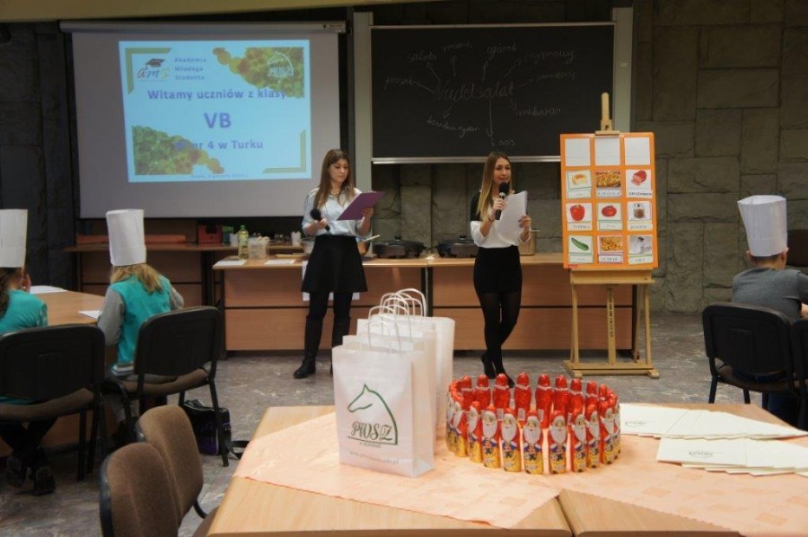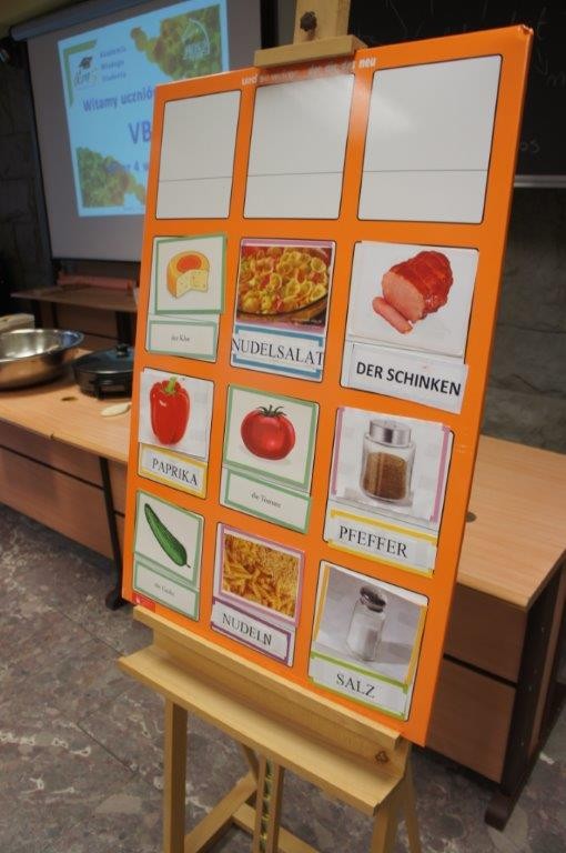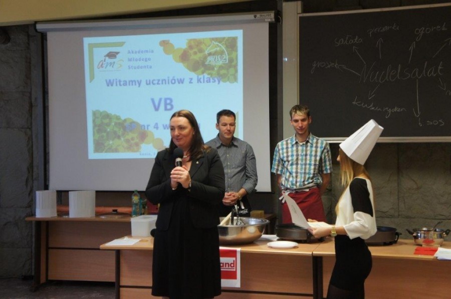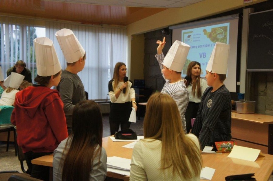 Tym razem gośćmi AMS byli uczniowie klasy 5b ze Szkoły Podstawowej nr 4 w Turku. Tematyka zajęć, które pod okiem dr Joanny Chojnackiej-Gärtner, prorektor ds. rozwoju i promocji, poprowadzili „starsi” studenci III roku germanistyki, była związana z kuchnią i kulinariami. Wyposażeni w deski i noże „młodsi” studenci kroili składniki sałatki makaronowej, czyli Nudelsalat. Wcześniej głośno powtarzali ich nazwy oraz nazwy przypraw. Określali też kolor: ‒ der rote Paprika, die grüne Gurke, der gelbe Käse, das weisse Salz, der schwarze Pfeffer. Dla utrwalenia słownictwa śpiewali przy akompaniamencie gitary piosenkę o przygotowywanej potrawie. Między kolejnymi wykonaniami przeboju tej akademii, studentki germanistyki sprawnie przeprowadzały konkursy wykorzystujące starszą i nowo nabytą wiedzę językową.