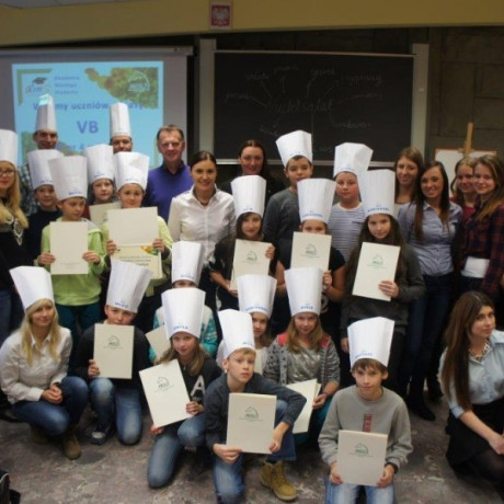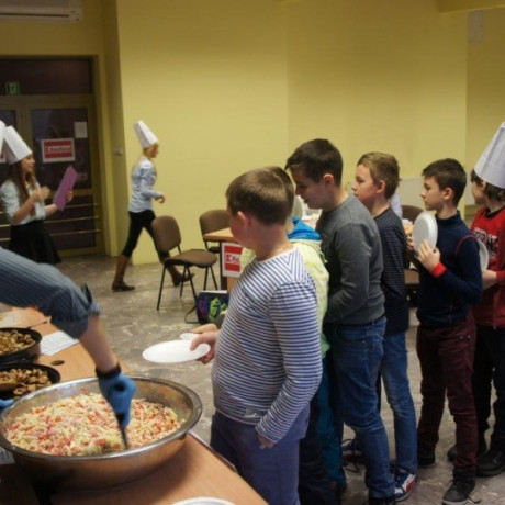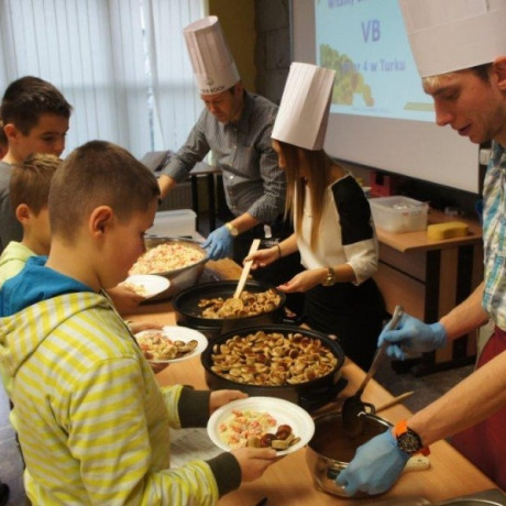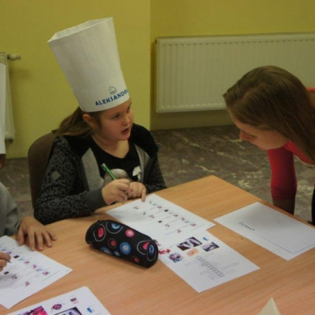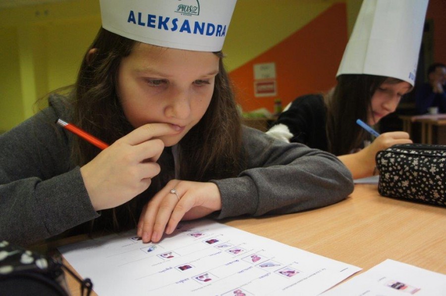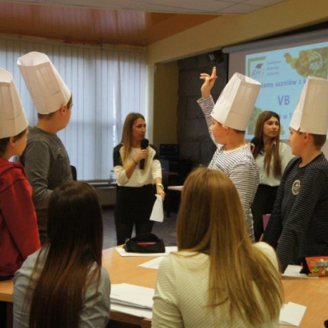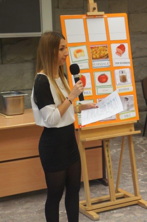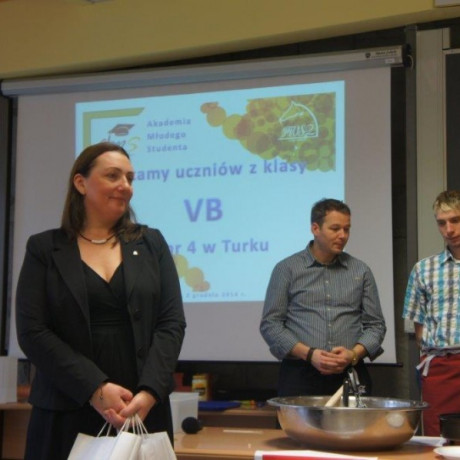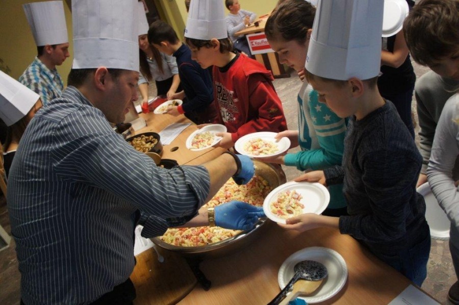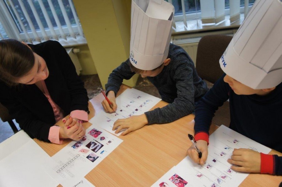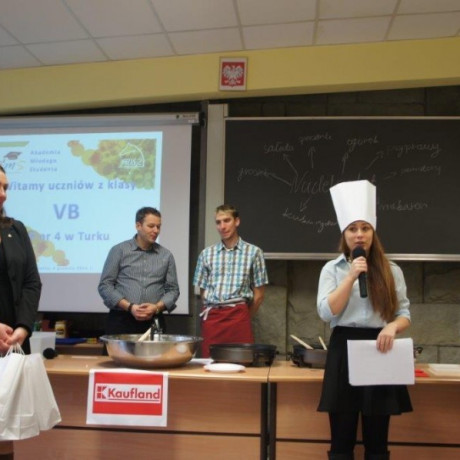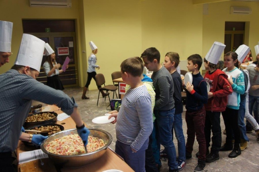 Tym razem gośćmi AMS byli uczniowie klasy 5b ze Szkoły Podstawowej nr 4 w Turku. Tematyka zajęć, które pod okiem dr Joanny Chojnackiej-Gärtner, prorektor ds. rozwoju i promocji, poprowadzili „starsi” studenci III roku germanistyki, była związana z kuchnią i kulinariami. Wyposażeni w deski i noże „młodsi” studenci kroili składniki sałatki makaronowej, czyli Nudelsalat. Wcześniej głośno powtarzali ich nazwy oraz nazwy przypraw. Określali też kolor: ‒ der rote Paprika, die grüne Gurke, der gelbe Käse, das weisse Salz, der schwarze Pfeffer. Dla utrwalenia słownictwa śpiewali przy akompaniamencie gitary piosenkę o przygotowywanej potrawie. Między kolejnymi wykonaniami przeboju tej akademii, studentki germanistyki sprawnie przeprowadzały konkursy wykorzystujące starszą i nowo nabytą wiedzę językową.