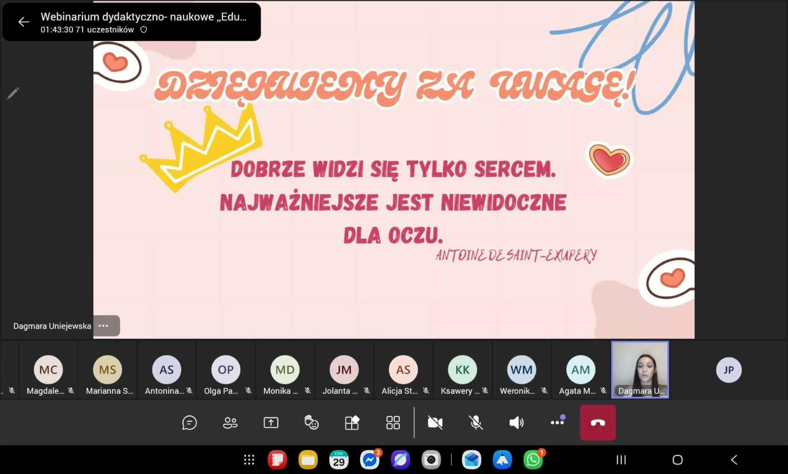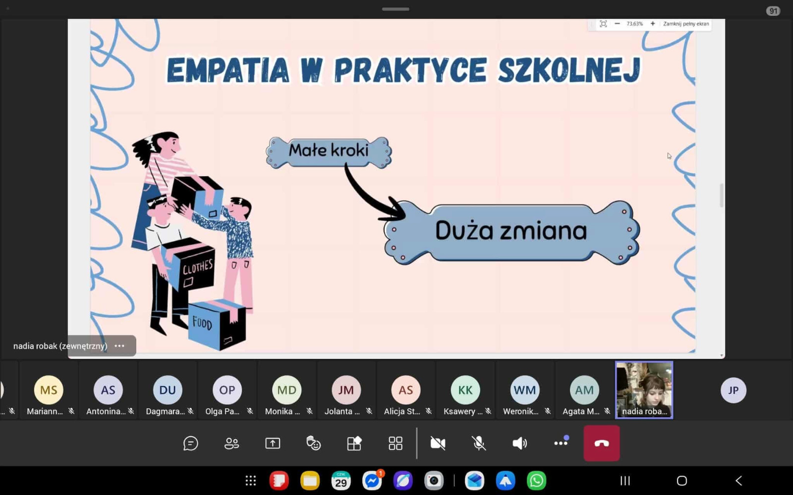 Opiekę merytoryczną nad webinarium, które odbyło się 29 stycznia, sprawowała dr Marianna Styczyńska, opiekunka SKN Młodych Pedagogów. – Mam nadzieję, że uczestniczki wyniosły z niego zarówno wiedzę teoretyczną, jak i praktyczne wskazówki dotyczące wdrażania empatii w edukacji – podsumowała. A dr Anna Stolarczyk-Gembiak, dziekan Wydziału Nauk Humanistycznych i Społecznych, przyznała jest ono inspiracją do dalszego rozwijania tematu tworzenia empatycznej szkoły.
