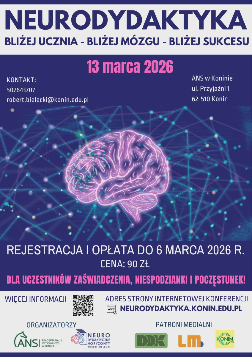 Przed nami VIII edycja Ogólnopolskiej Konferencji „Neurodydaktyka: Bliżej Ucznia – Bliżej Mózgu – Bliżej Sukcesu” – wydarzenia realizowanego wspólnie przez Neurodydaktyczne Horyzonty Roberta Bieleckiego oraz Wydział Nauk Humanistycznych i Społecznych Akademii Nauk Stosowanych w Koninie.