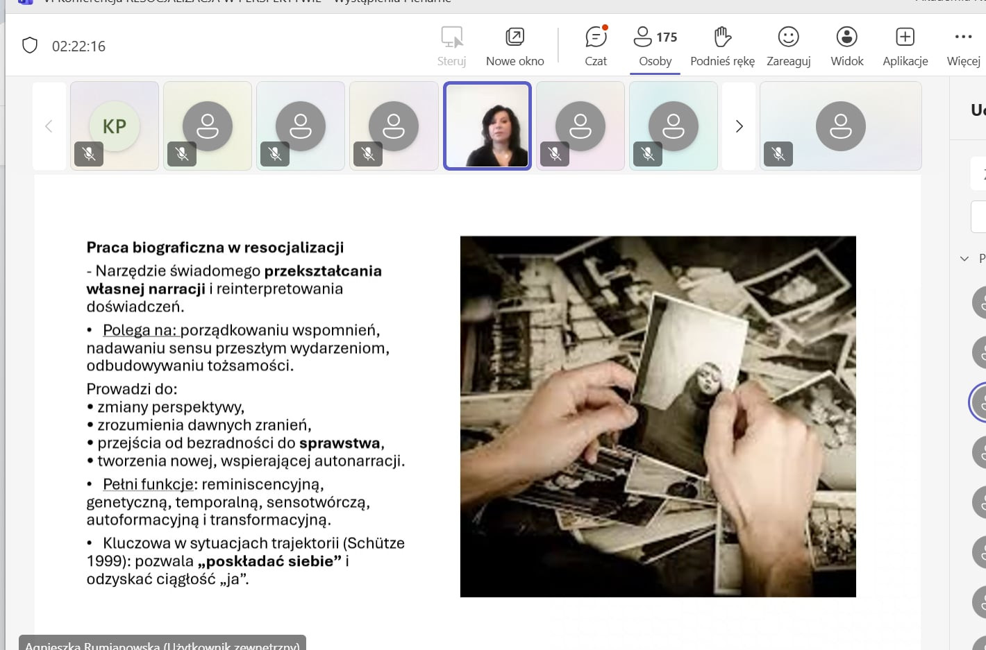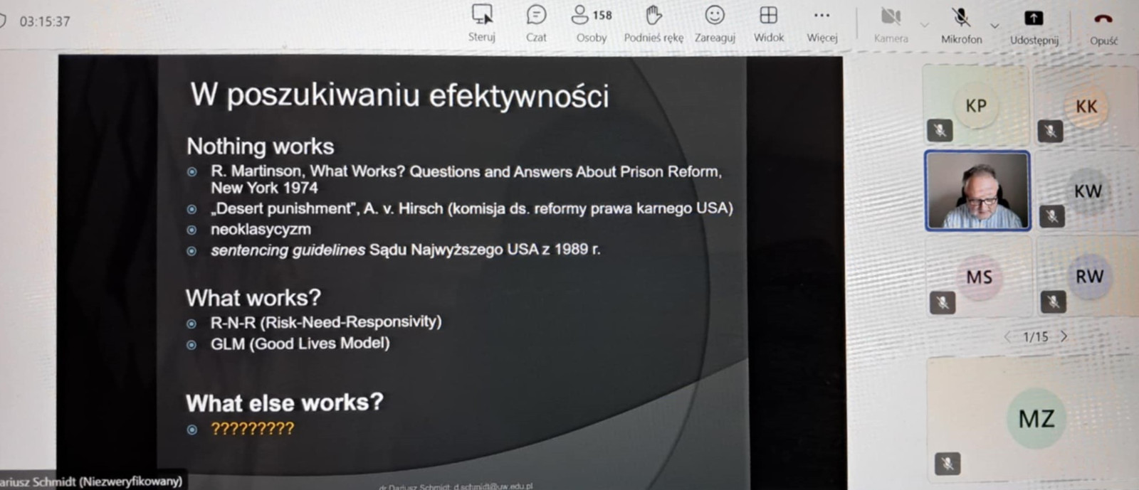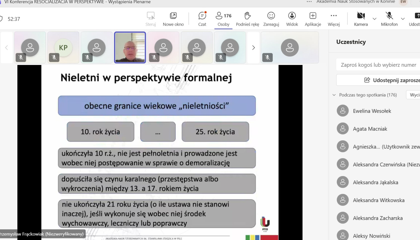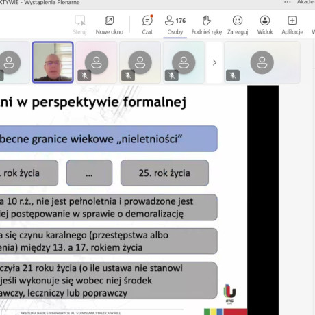 Zróżnicowana tematyka dotyczyła również kwestii rodzinnych i narracyjnych. Dr Roman Waluś z UBB omówił rolę rodziny w resocjalizacji nieletnich, natomiast dr hab. Agnieszka Rumianowska, prof. AM/ANS, znaczenie narracji biograficznych jako narzędzia odzyskiwania sprawstwa. Osadzenie zagadnienia w perspektywie porównawczej zapewnił dr Dariusz Szmidt (UW), przedstawiając ewolucję systemów penitencjarnych w krajach niemieckojęzycznych.