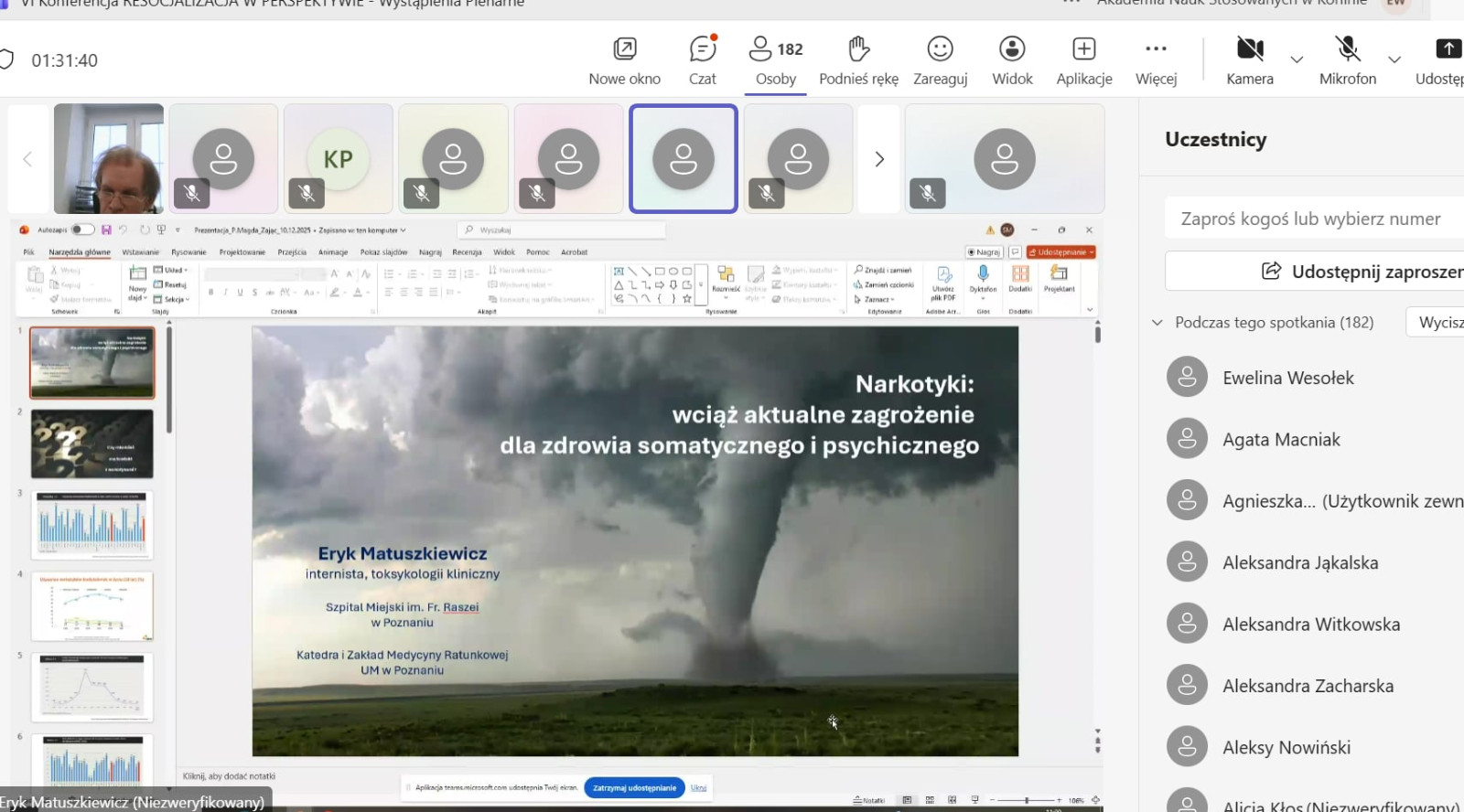 Szczególnie wartościowe było zestawienie dwóch komplementarnych perspektyw: insp. Przemysław Kozanecki, komendant KMP w Koninie, omówił aktualny stan bezpieczeństwa oraz organizację służb w powiecie konińskim, a dr n. med. Eryk Matuszkiewicz z UM w Poznaniu przedstawił medyczne konsekwencje stosowania narkotyków, ukazując ich wpływ na zdrowie somatyczne i psychiczne.
