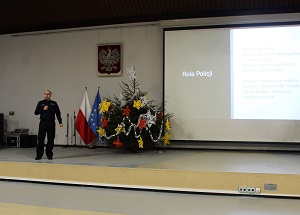 O przestępstwach domowych w kontekście działań dochodzeniowo-śledczych oraz prewencyjnych policji mówił mgr Damian Kasprzak podczas wykładu przygotowanego dla uczniów Klasy Akademickiej – Resocjalizacja z Zespołu Szkół Centrum Kształcenia Ustawicznego im. Stefana Batorego w Koninie.