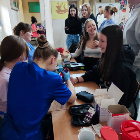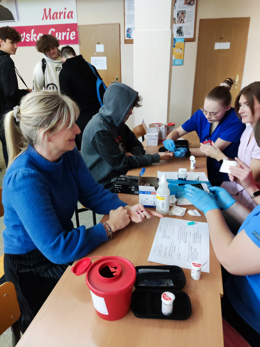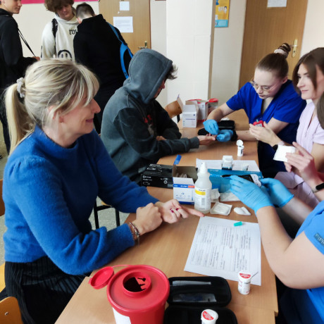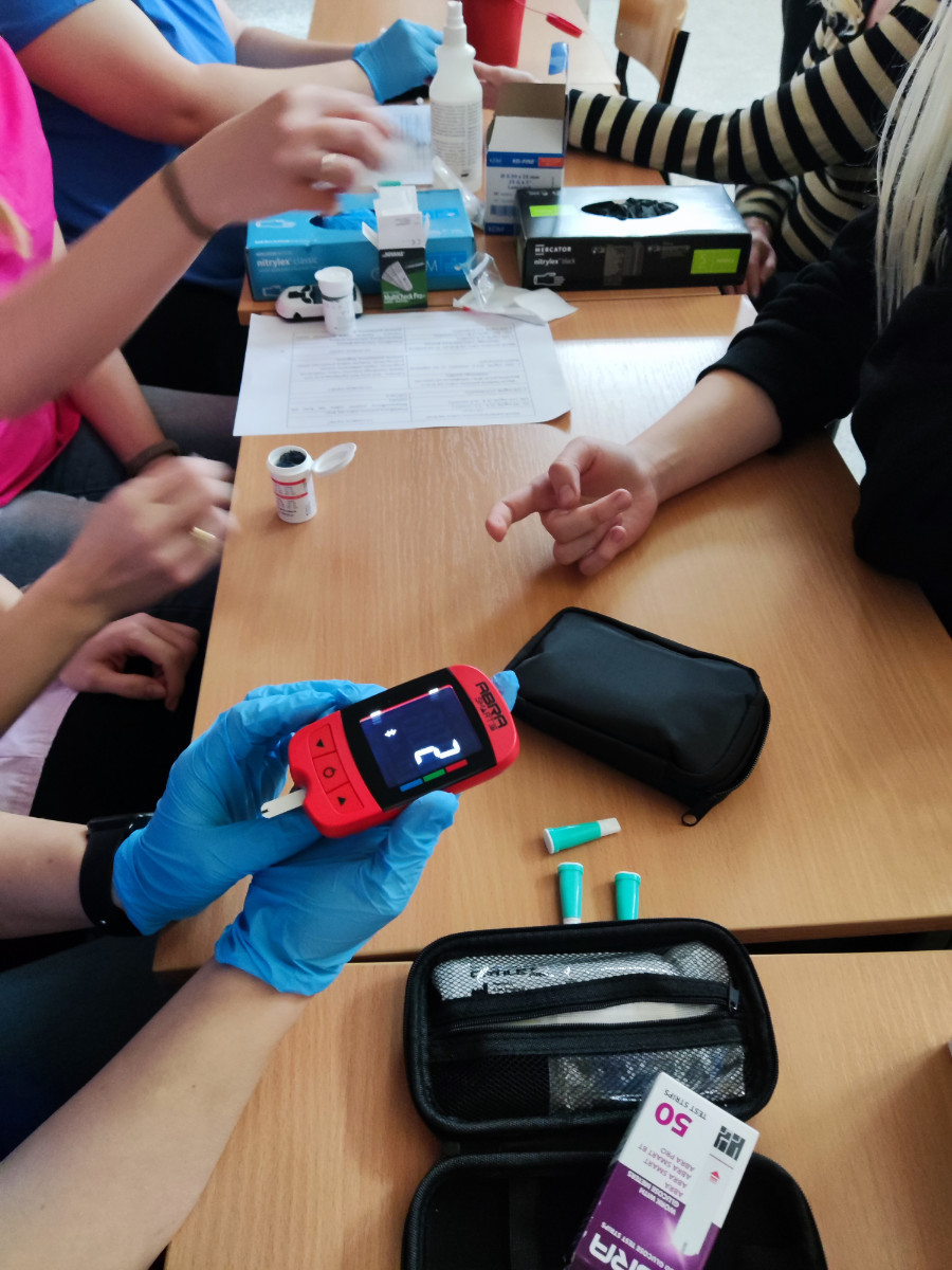 Podczas spotkania dr Alina Roszak, menedżer kierunków zdrowie publiczne i pielęgniarstwo (II stopnia) omówiła cukrzycę jako jednostkę chorobową, jej rozwój, przebieg oraz metody leczenia. W drugiej części spotkania studenci przeprowadzili badania przesiewowe wśród uczniów, sprawdzając poziom glukozy we krwi oraz mierząc ciśnienie tętnicze.