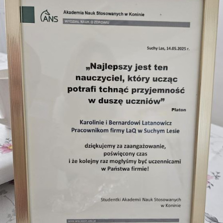 Dr Agnieszka Saran-Jagodzińska, adiunkt na WNZ, która wybrała się ze studentkami do firmy LaQ, podkreśla serdeczną atmosferę, jaką je otoczono. – Dziewczyny na pewno zapamiętają ten dzień na zawsze – uważa.