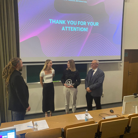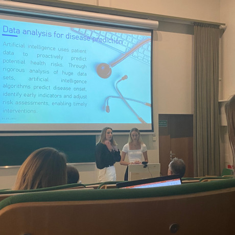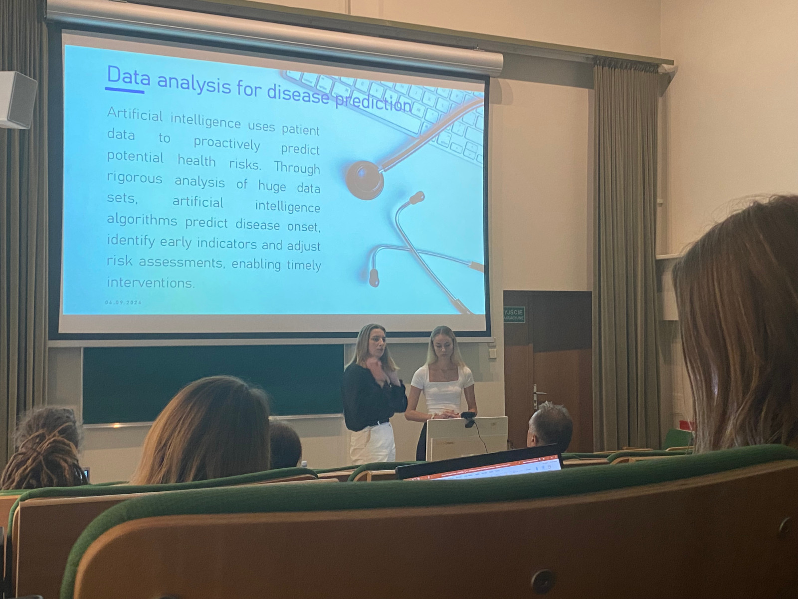 Druga grupa studentów przygotowała prezentację „Od algorytmu do diagnozy. Sztuczna inteligencja w ochronie zdrowia”, w której przedstawiła kluczowe aspekty rozwoju algorytmów oraz ich zastosowanie w procesie diagnozowania medycznego, podkreślając znaczenie nowoczesnych technologii w usprawnianiu procedur medycznych i poprawie jakości opieki zdrowotnej.