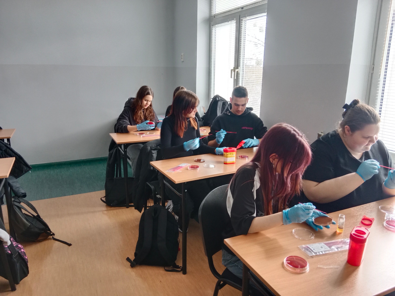 Po tym zastrzyku teorii przyszedł czas na praktykę. – Każdy z uczniów wykonał posiew redukcyjny z materiału badanego, którym był sok owocowy. Posiew redukcyjny służy do izolacji pojedynczej kolonii z badanego materiału – wyjaśniła dr Drela. I zapewniła, że podczas zajęć zachowano wszelkie środki bezpieczeństwa mikrobiologicznego. Do posiewu użyto sterylnych gotowych podłoży, sterylnych ezy, czyli przyrządów do przenoszenia materiału biologicznego, a każdy uczeń miał na sobie rękawiczki ochronne.