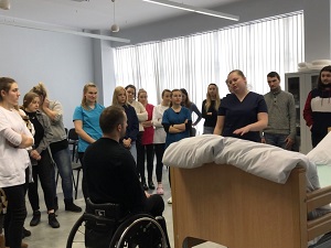 Opieka nad pacjentem z porażeniem dwu i czterokończynowym to główny temat spotkania studentek pielęgniarstwa z p. Przemkiem Stelmasikiem.