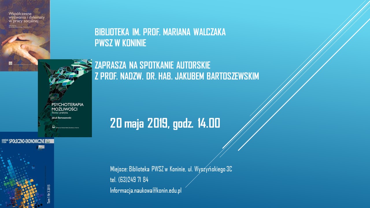 Zapraszamy na spotkanie autorskie z prof. nadzw. dr. hab. Jakubem Bartoszewskim, które odbędzie się w dniu 20 maja 2019 r. w Bibliotece PWSZ w Koninie, ul. Wyszyńskiego 3C