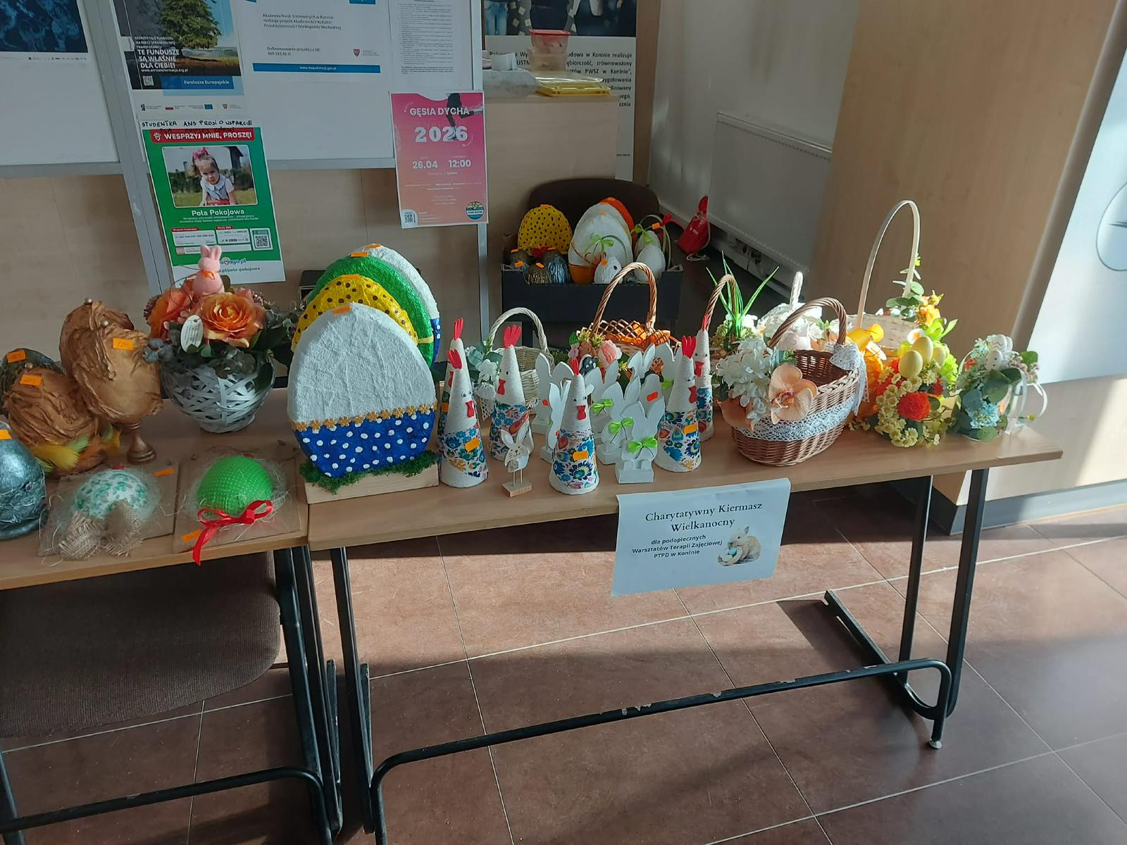 31 marca na stolikach ustawionych w głównym holu budynku uczelni przy ul. Przyjaźni znalazły się unikatowe prace uczestników warsztatu – efekt ich zaangażowania, kreatywności oraz codziennej pracy terapeutycznej. Uzupełnieniem były świeże domowe ciasta i ciasteczka przygotowane przez studentów. Zarówno rękodzieło, jak i wypieki cieszyły się dużym zainteresowaniem odwiedzających.