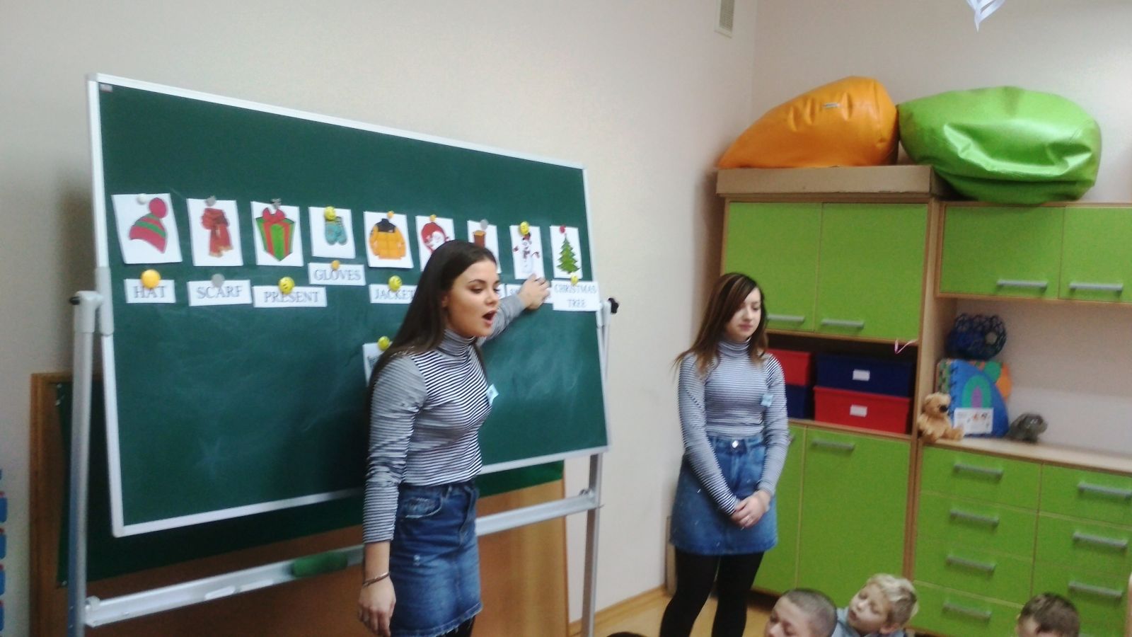 Studentki pedagogiki powitały dzieci listem od Pani Zimy, która zwróciła się do nich z prośbą o wykonanie kilku trudnych zadań. Dzieci musiały wykazać się wiedzą na temat zimy i tego co ze sobą niesie, jakimi darami, niespodziankami i przyjemnościami nas obdarowuje i jak z nich mądrze korzystać. Dzieci dobierały stroje odpowiednio do pogody i wykonywały ilustracje zimową techniką collage. Miały tez okazję poćwiczyć słownictwo związane z ubraniami w języku angielskim.