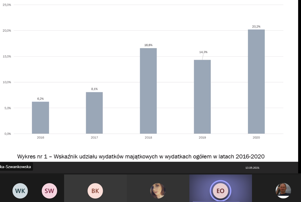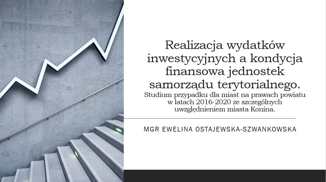 Ewelina Ostajewska-Szwankowska, wykładowca PWSZ w Koninie i inspektor w Wydziale Kontroli Urzędu Miejskiego w Koninie, wystąpiła z referatem „Realizacja wydatków inwestycyjnych a kondycja finansowa jednostek samorządu terytorialnego w latach 2016-2020”. Przedstawiła w niej analizę ex post wydatków miast na prawach powiatu ze szczególnym uwzględnieniem Konina. Wyniki jej badań wykazały, że miasto ma coraz mniejszą zdolność do samodzielnego finansowania własnych inwestycji. Oznacza to konieczność zaciągania zobowiązań, czego potwierdzeniem jest sukcesywny wzrost wskaźnika długu ogółem na jednego mieszkańca.