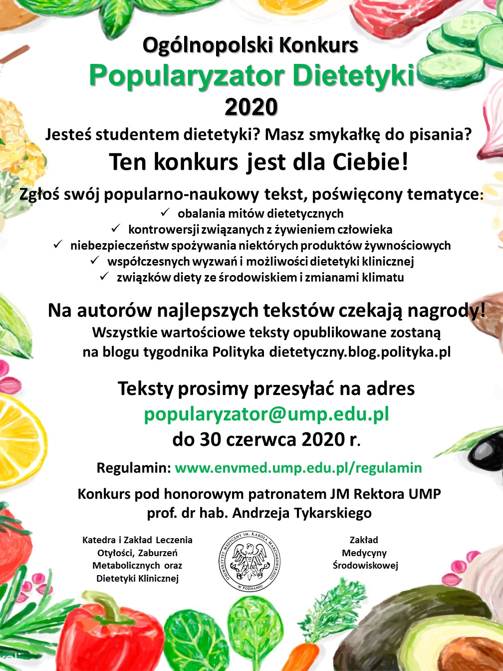Katedra i Zakład Leczenia Otyłości, Zaburzeń Metabolicznych oraz Dietetyki Klinicznej wraz z Zakładem Medycyny Środowiskowej UM w Poznaniu ogłaszają Ogólnopolski Konkurs „Popularyzator Dietetyki 2020” pod honorowym patronatem JM Rektora prof. dr hab. Andrzeja Tykarskiego.