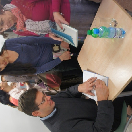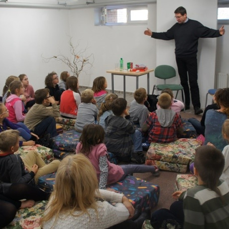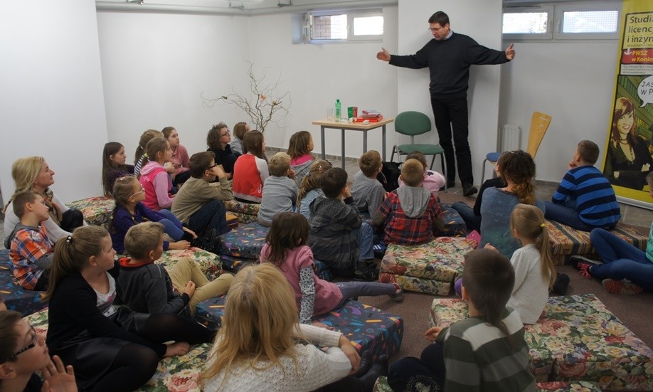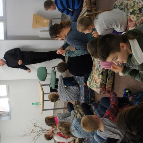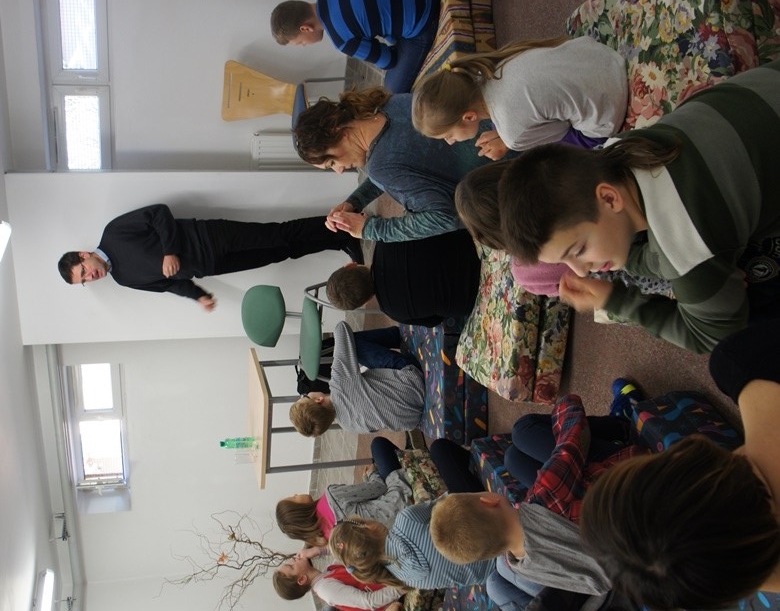 Po wykładzie odbyło się spotkanie z Pawłem Beręsewiczem, autorem książek dla dzieci i młodzieży. Pisarz, ale też poeta, tłumacz, leksykograf, ale i znawca młodych głów oraz dusz poważnie i żartem odpowiadał na pytania dzieci, które przyszły na spotkanie z nim.