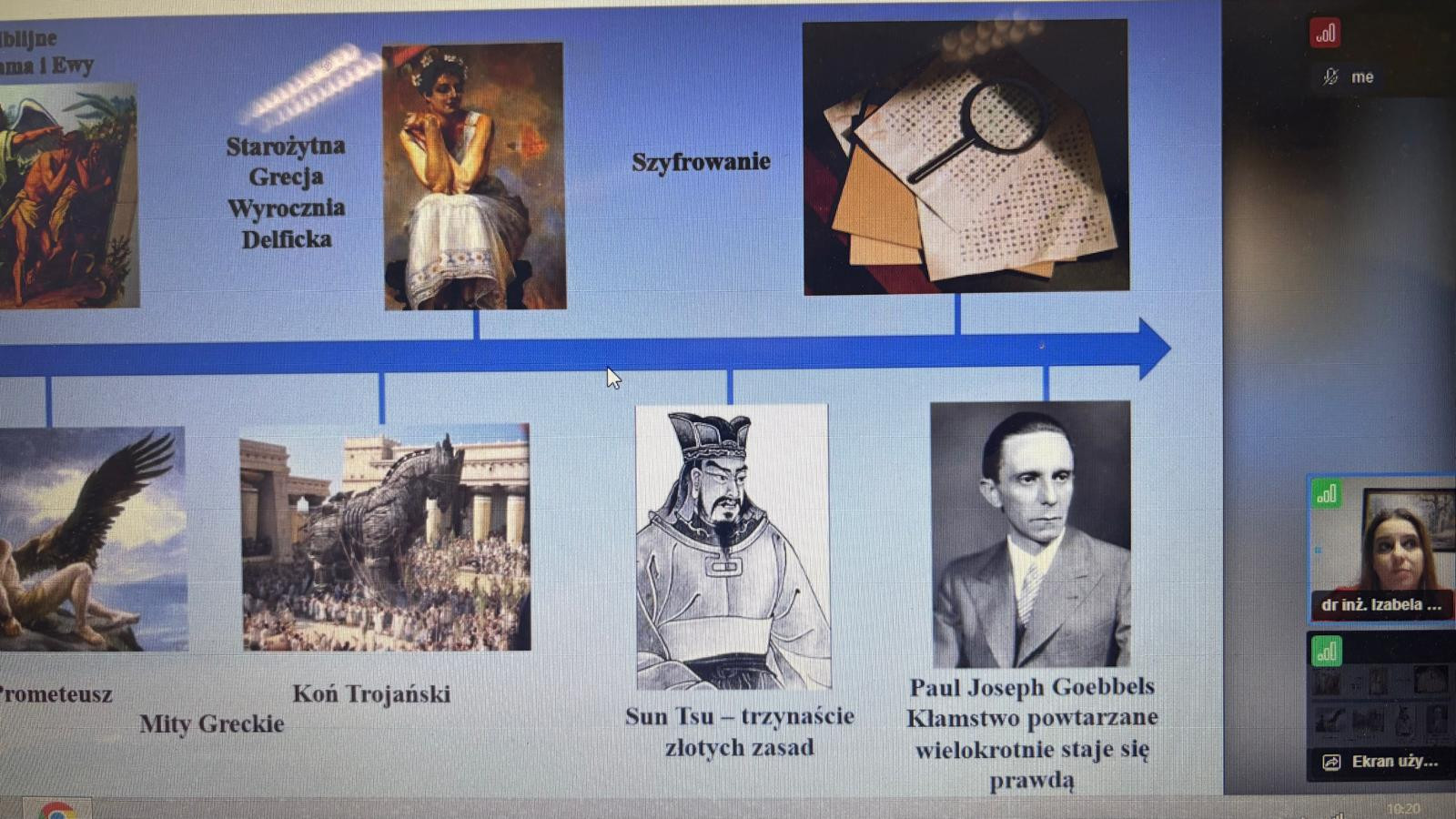 Tematem wykładu była „Dezinformacja – ujęcie teoretyczne, przykłady technik manipulacyjnych w mediach”. Uczniowie poznali podstawowe definicje i cechy dezinformacji oraz jej cele i wielowymiarowy charakter. Prowadząca omówiła zarówno świadome działania manipulacyjne, jak i niezamierzone zniekształcenia przekazu, prezentując historyczne przykłady manipulacji — od narracji antycznych, przez strategie opisane przez Sun Tzu, aż po propagandę XX wieku.