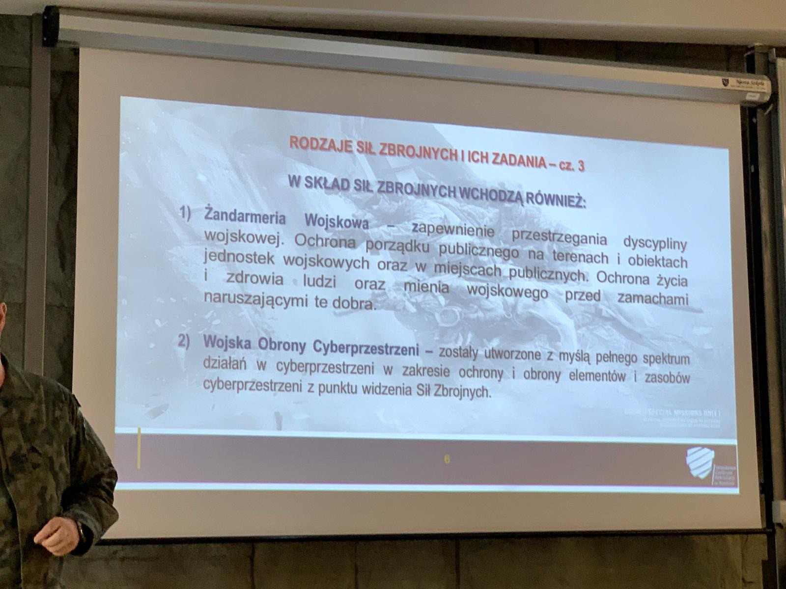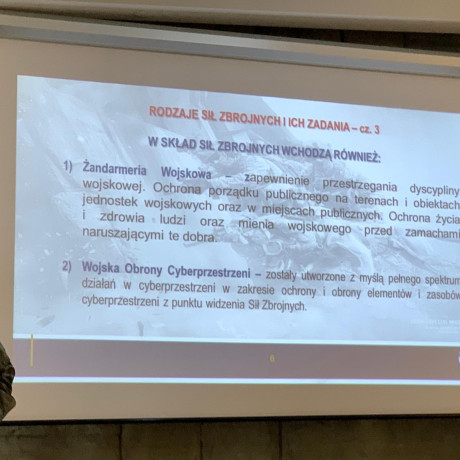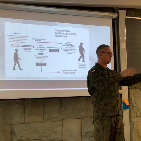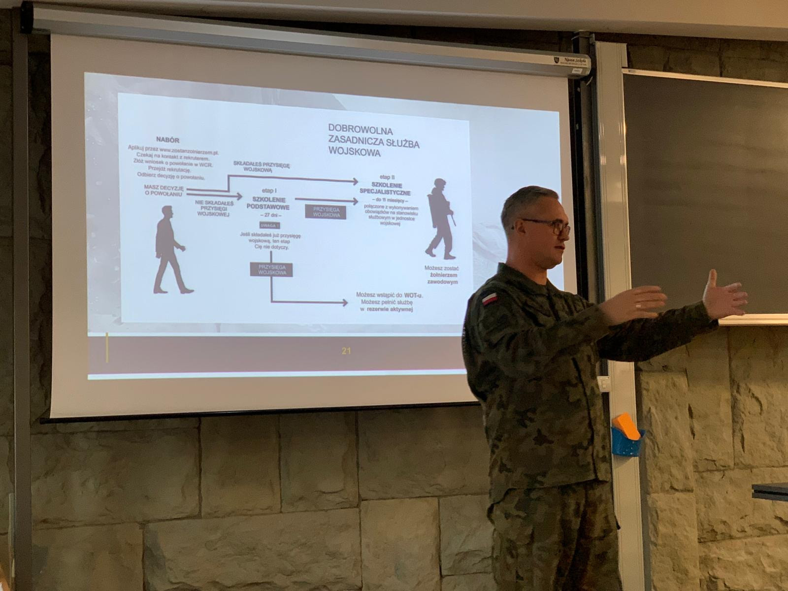 Spotkanie z przedstawicielami WCR (21 listopada) pozwoliło studentom zapoznać się z możliwościami wynikającymi ze służby w wojsku, oraz dowiedzieć się, jakie warunki spełnić, aby dołączyć do Sił Zbrojnych. Goście krok po kroku przedstawiali podstawowe wymagania dla kandydatów, a dotyczące wieku, zdrowia fizycznego i psychicznego, a także wykształcenia. Wyjaśnili, że dla każdej specjalizacji i korpusu osobowego określono minimalne kwalifikacje, które umożliwiają rozpoczęcie kariery. Wojsko Polskie proponuje bowiem różnorodne ścieżki rozwoju, od służby w Wojskach Lądowych, przez Siły Powietrzne, aż po Marynarkę Wojenną, Wojska Specjalne i Wojska Obrony Terytorialnej.