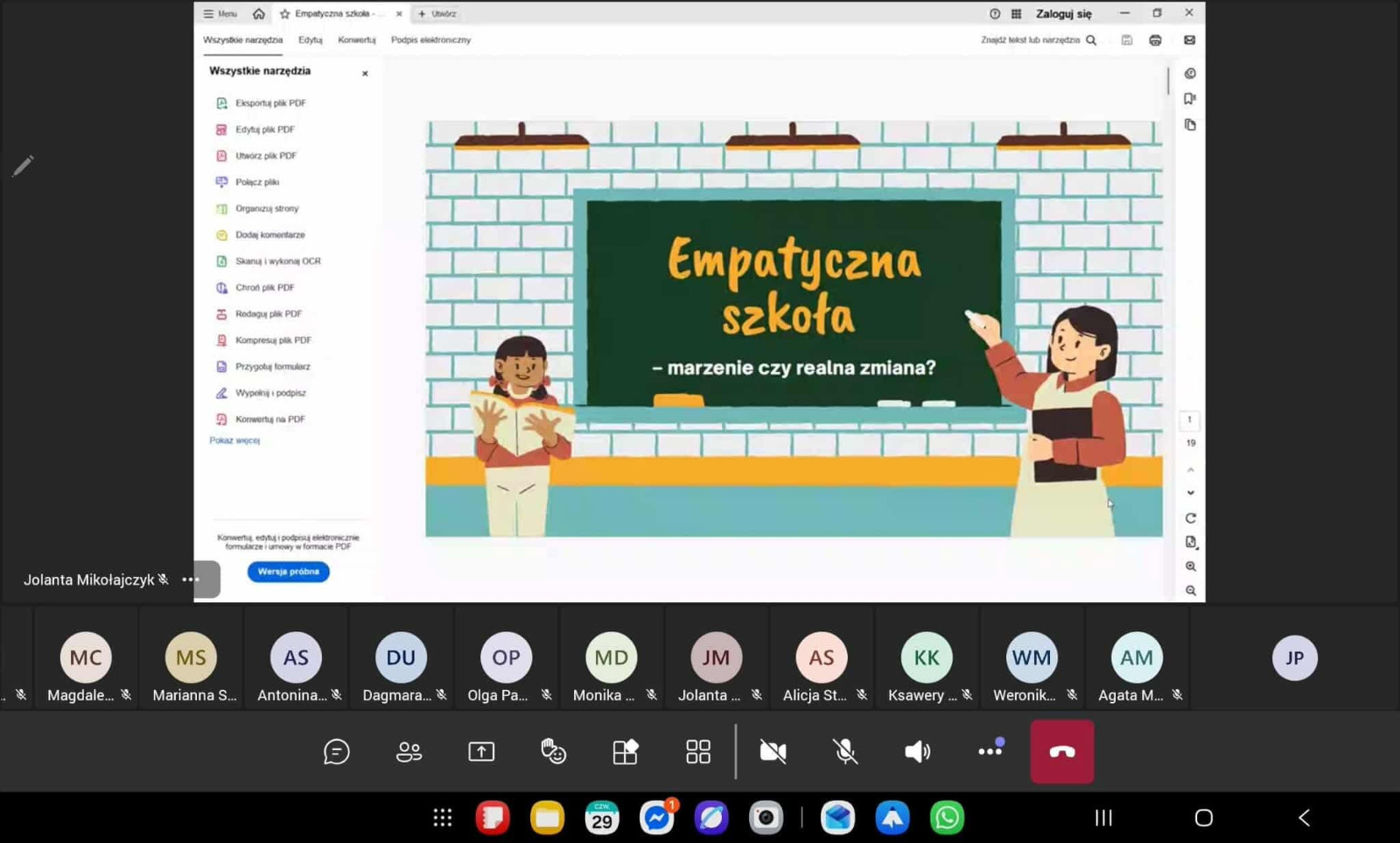 Prelegentki przedstawiły wizję szkoły przyszłości, w której empatia odgrywa kluczową rolę. Szczególną uwagę poświęciły wypaleniu zawodowemu nauczycieli. Właśnie w takich sytuacjach, jak podkreślały, empatia ma znaczącą rolę jako narzędzie przeciwdziałania temu zjawisku. Z drugiej strony przytoczyły wyniki badań, które pokazały, że im bardziej empatyczna jest edukacja, tym niższe jest ryzyko występowania depresji wśród uczniów. Zauważono istotny związek między empatią a zdrowiem psychicznym. Dotyczy to wszystkich stron procesu nauczania, uczniów, ich rodziców i nauczycieli.