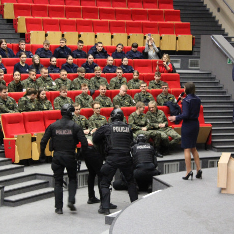 W dniu I Ogólnopolskiej Konferencji Naukowej „Współczesne bezpieczeństwo międzynarodowe w spojrzeniu generacji Y”, która odbyła się 19 kwietnia br. studenci wszystkich roczników kierunku bezpieczeństwo wewnętrzne, a także uczniowie mundurowych klas akademickich, mieli okazję zapoznać się z najnowszymi wytycznymi, jakie trzeba spełnić do pełnienia służby w polskiej policji. W spotkaniu brali udział funkcjonariusze Komendy Miejskiej Policji w Koninie wraz z funkcjonariuszami Komendy Wojewódzkiej Policji w Poznaniu. Oficer z wydziału kadr KWP w Poznaniu Pani komisarz Anna Starzyńska-Patyna przedstawiła najnowsze kryteria i kwestie formalne niezbędne do pełnienia służby, natomiast Pani mł. aspirant Sylwia Król przybliżyła młodzieży warunki i specyfikę pracy. Zwieńczeniem spotkania był ćwiczebny pokaz zatrzymania sprawców przez funkcjonariuszy z grupy interwencyjnej Komendy Miejskiej Policji w Koninie. Całość przedsięwzięcia cieszyła się dużym zainteresowaniem ze strony studentów i być może niebawem jakaś cześć absolwentów ANS w Koninie zasili szeregi Wielkopolskiej Policji.