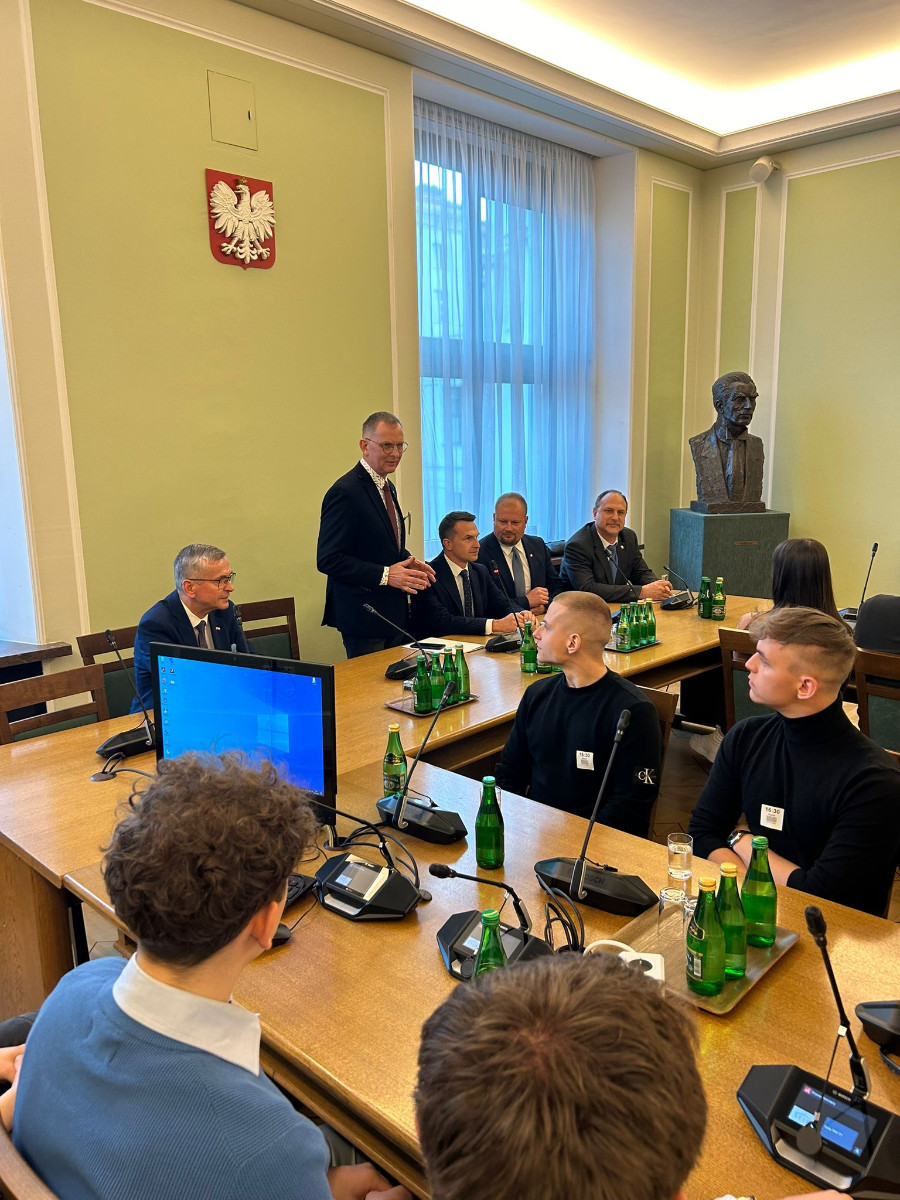 Następnie uczestnicy przeszli do sali im. Macieja Rataja na spotkanie z Adamem Szłapką, ministrem ds. Unii Europejskiej, Witoldem Zembaczyńskim, posłem na Sejm RP, członkiem komisji śledczej ds. Pegasusa, i Andrzejem Szewińskim, posłem na Sejm RP, zastępcą przewodniczącego Komisji Obrony Narodowej.
