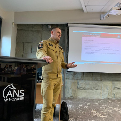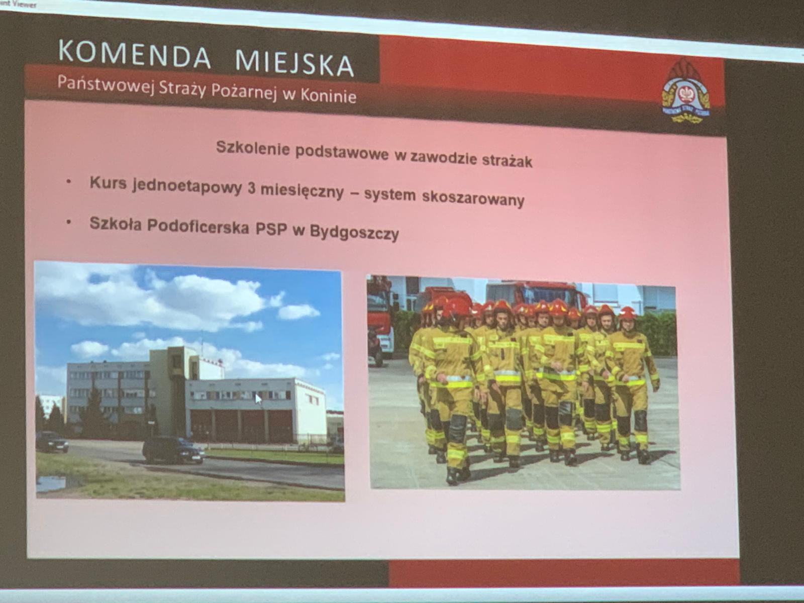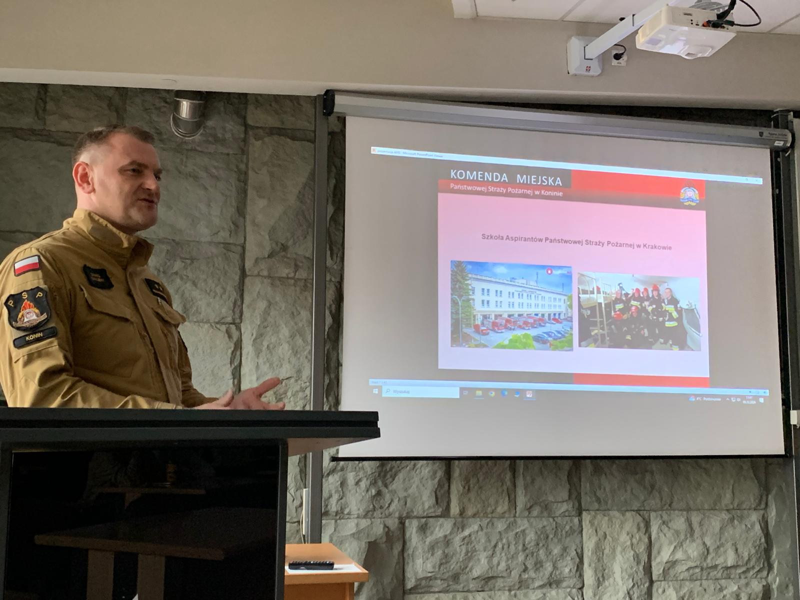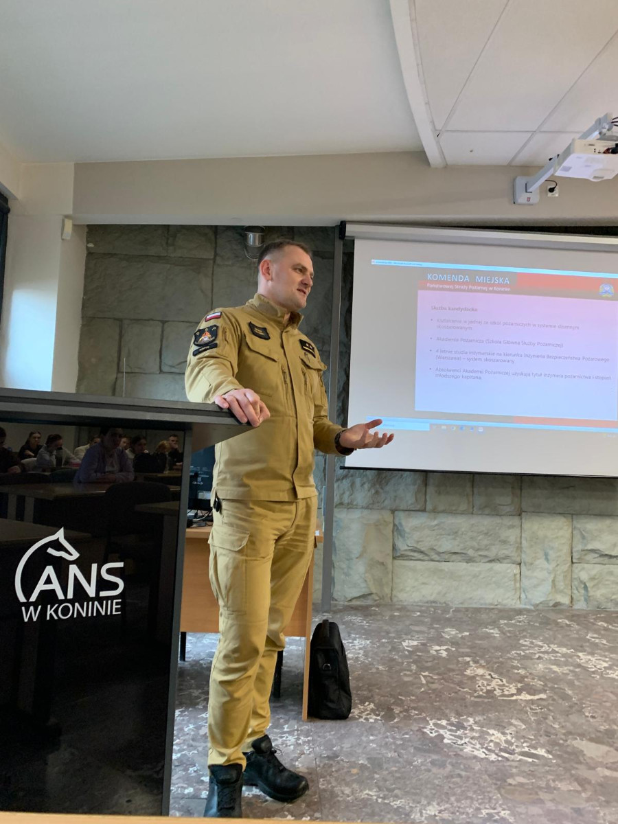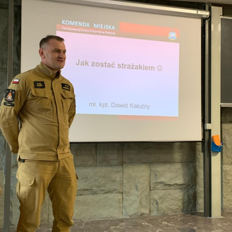 – Zostanie strażakiem to nie tylko wybór zawodu, ale przede wszystkim powołanie do niesienia pomocy innym – tymi słowami mł. kpt. Dawid Kałużny z Komendy Miejskiej Państwowej Straży Pożarnej (PSP) w Koninie rozpoczął swoją prezentację na temat naboru do tej służby. Podczas spotkania ze studentami I roku BW, które odbyło się 5 grudnia, podkreślił, że strażacy codziennie ryzykują własne życie, aby ratować innych, bez względu na porę dnia, pogodę czy okoliczności. Ich działania są postrzegane jako szczere i wolne od politycznych czy finansowych wpływów, co tylko wzmacnia ich autentyczność. – Nie tylko gaszą pożary, ale pomagają w wypadkach drogowych, podczas klęsk żywiołowych, a nawet ratują zwierzęta – opowiadał.