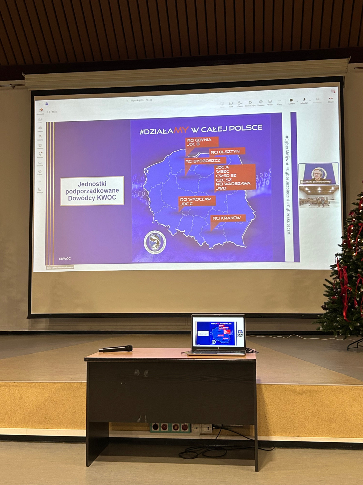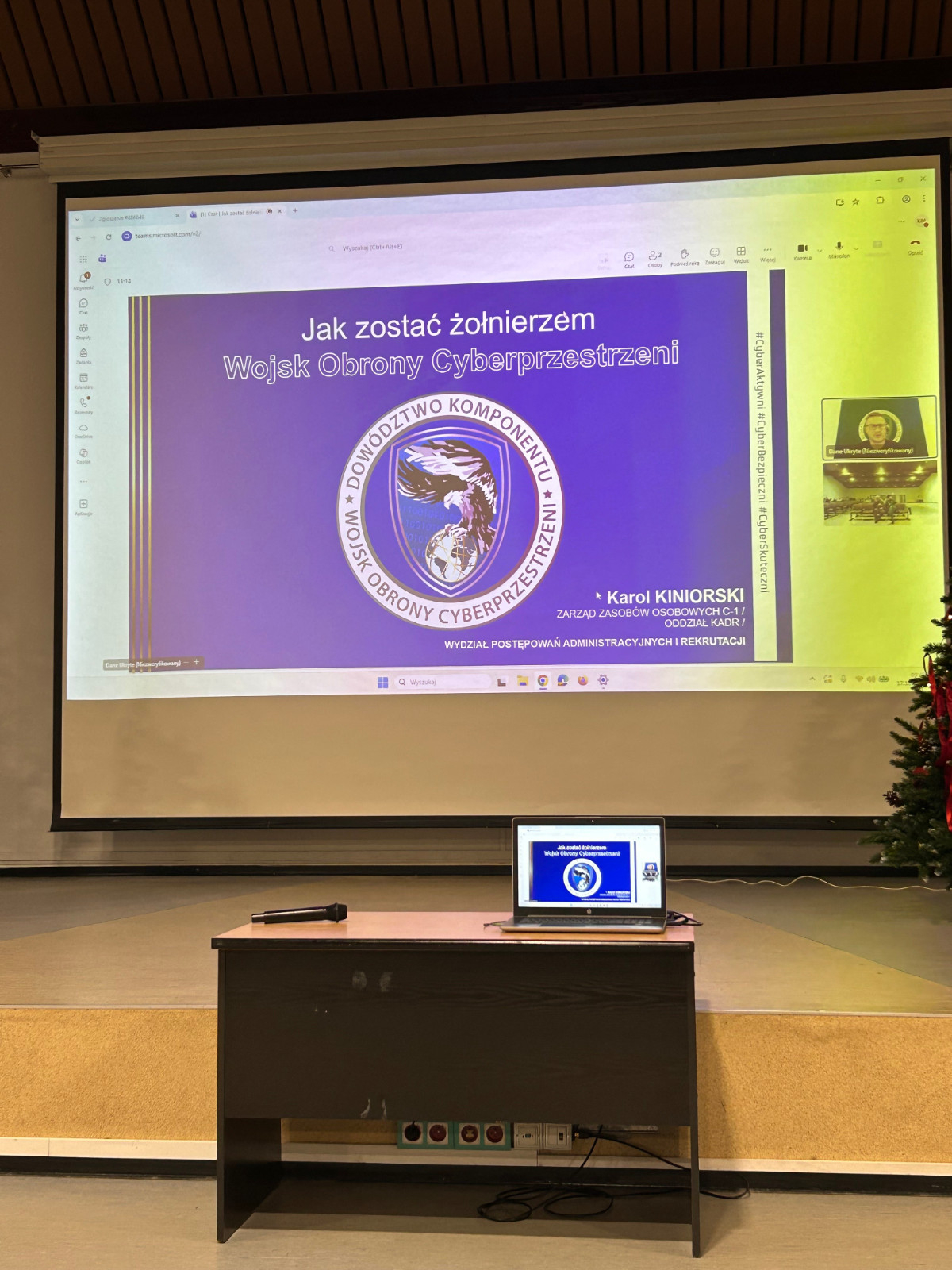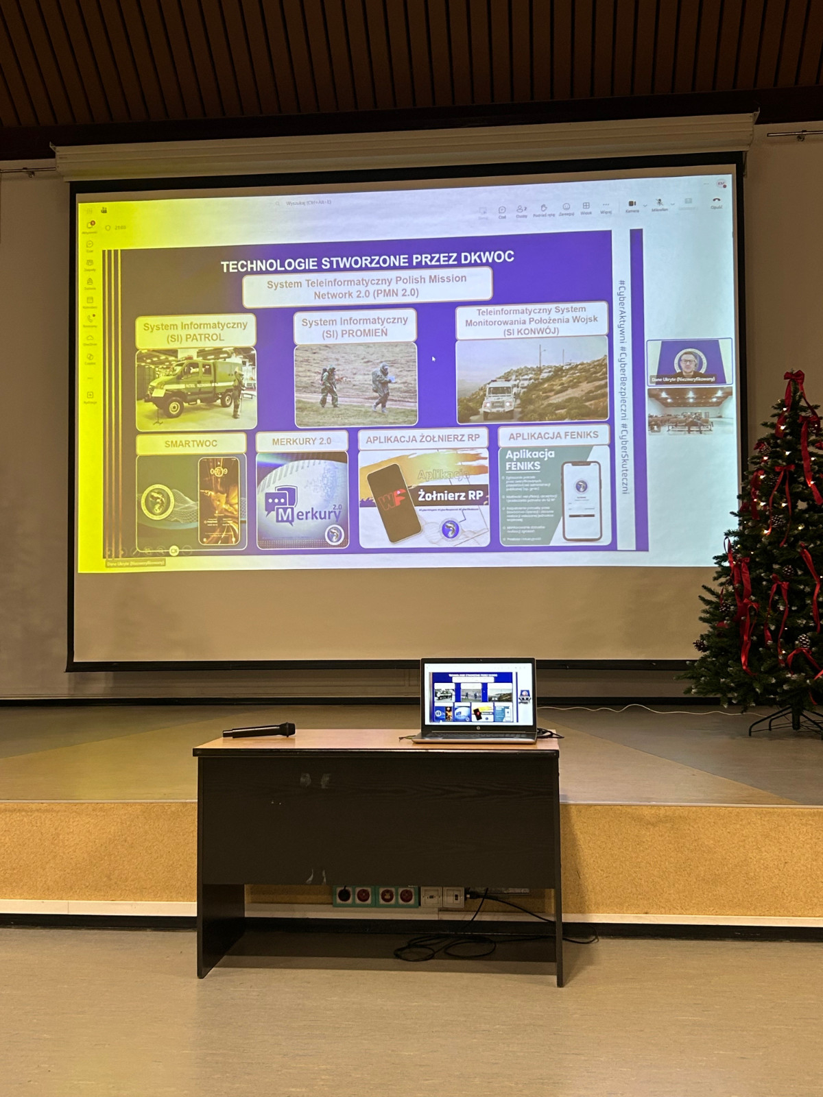 Wykład poprowadził Karol Kiniorski, przedstawiciel Wojsk Obrony Cyberprzestrzeni, który przedstawił rolę WOC w systemie bezpieczeństwa państwa oraz zakres zadań realizowanych przez ten specjalistyczny komponent Sił Zbrojnych RP.