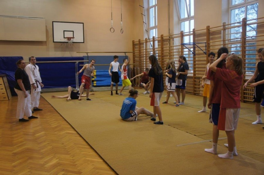 Na koniec dr Julian Jaroszewski i Marika Piotrowska, studentka II roku wychowania fizycznego, na zajęciach z samoobrony pokazali jak wygląda obrona przed chwytami i obchwytami tułowia.