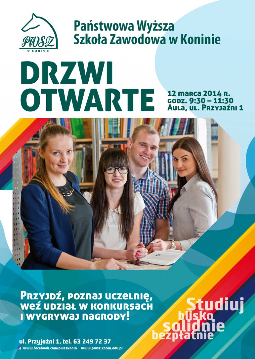 Państwowa Wyższa Szkoła Zawodowa w Koninie jak co roku organizuje „Drzwi Otwarte” dla uczniów klas maturalnych, na których młodzież będzie mogła zapoznać się z ofertą naszej Uczelni. Będzie to świetna okazja do porozmawiania ze studentami i wykładowcami.