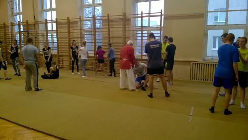 Uczniowie rozpoczęli zajęcia od aerobiku,który przeprowadziła dr Edyta Bielik. Po intensywnej rozgrzewce wszyscy przystąpili do ćwiczeń z samoobrony.Jej tajniki zdradzał i kontrolował wykonanie sensej JU JITSU Wojciech Malczak.