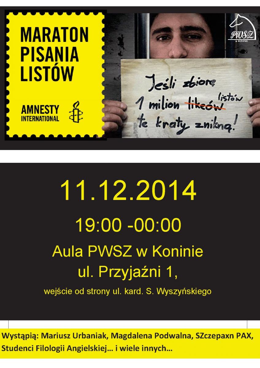 Już drugi raz Maraton Pisania Listów organizują studenci PWSZ w Koninie. Komu nie są obojętne losy ludzi więzionych za przekonania, może wstąpić wieczorem 11 grudnia do budynku uczelni przy ul. Przyjaźni i napisać apel w obronie jednej z siedmiu wybranych osób.