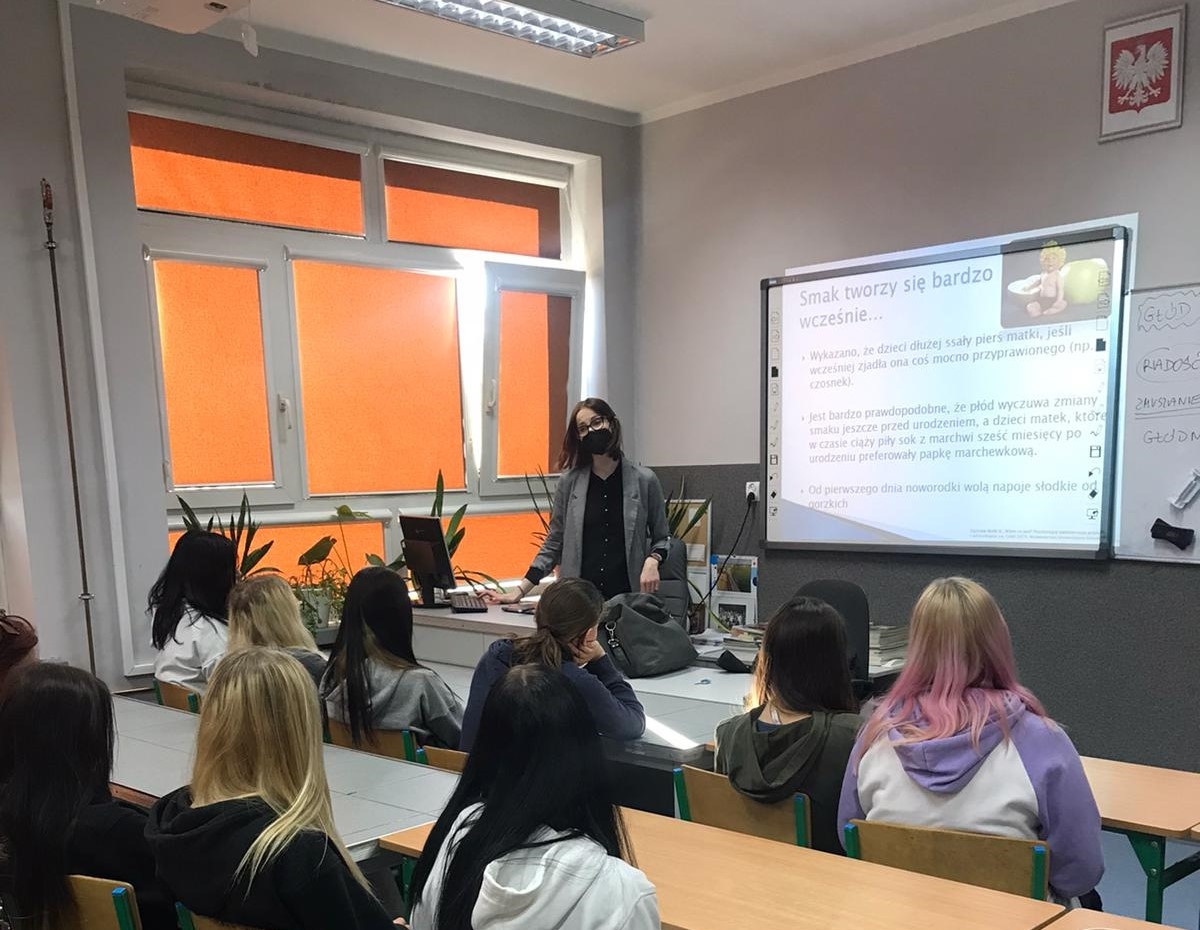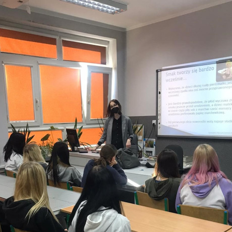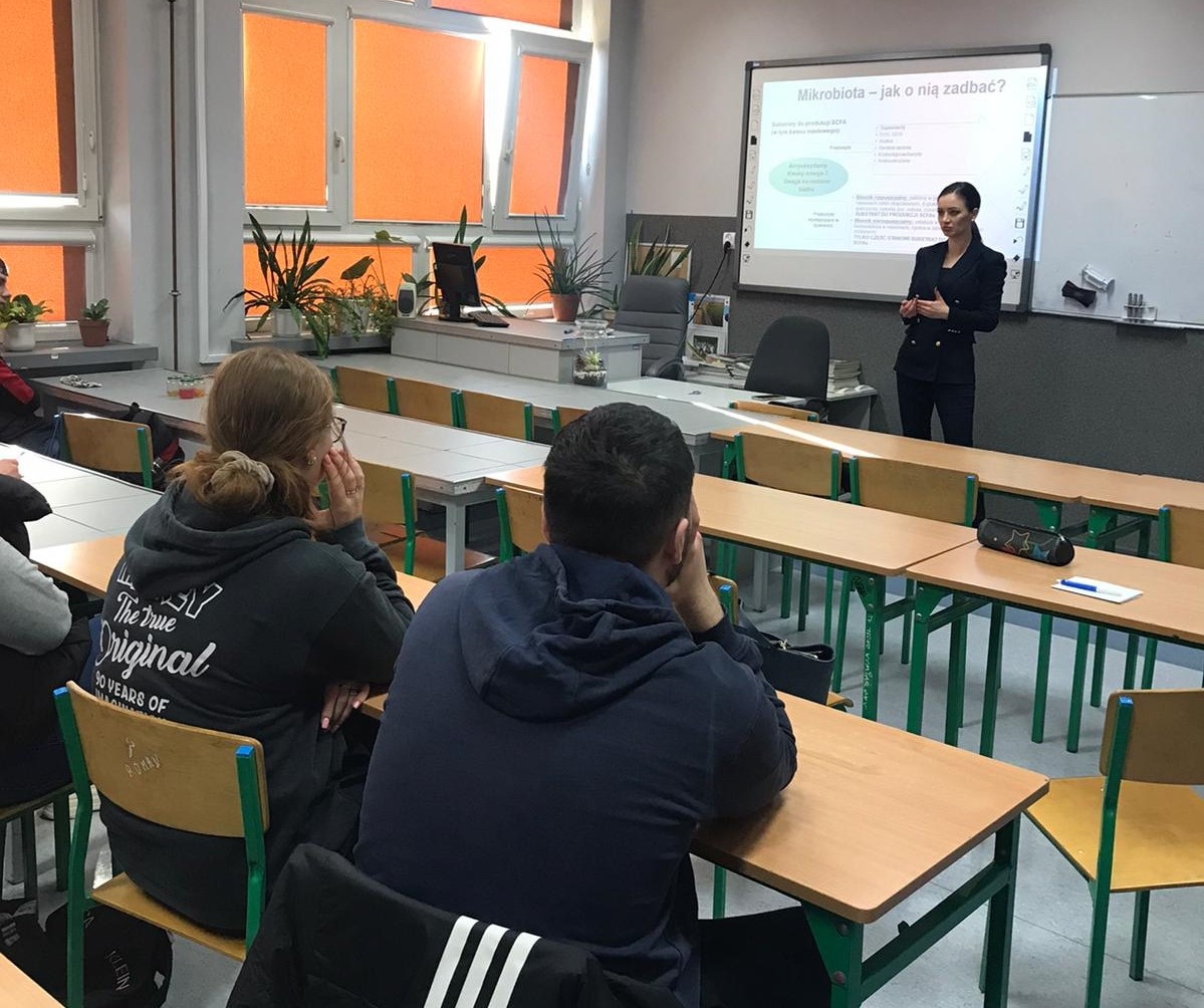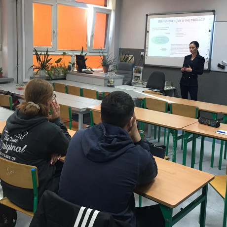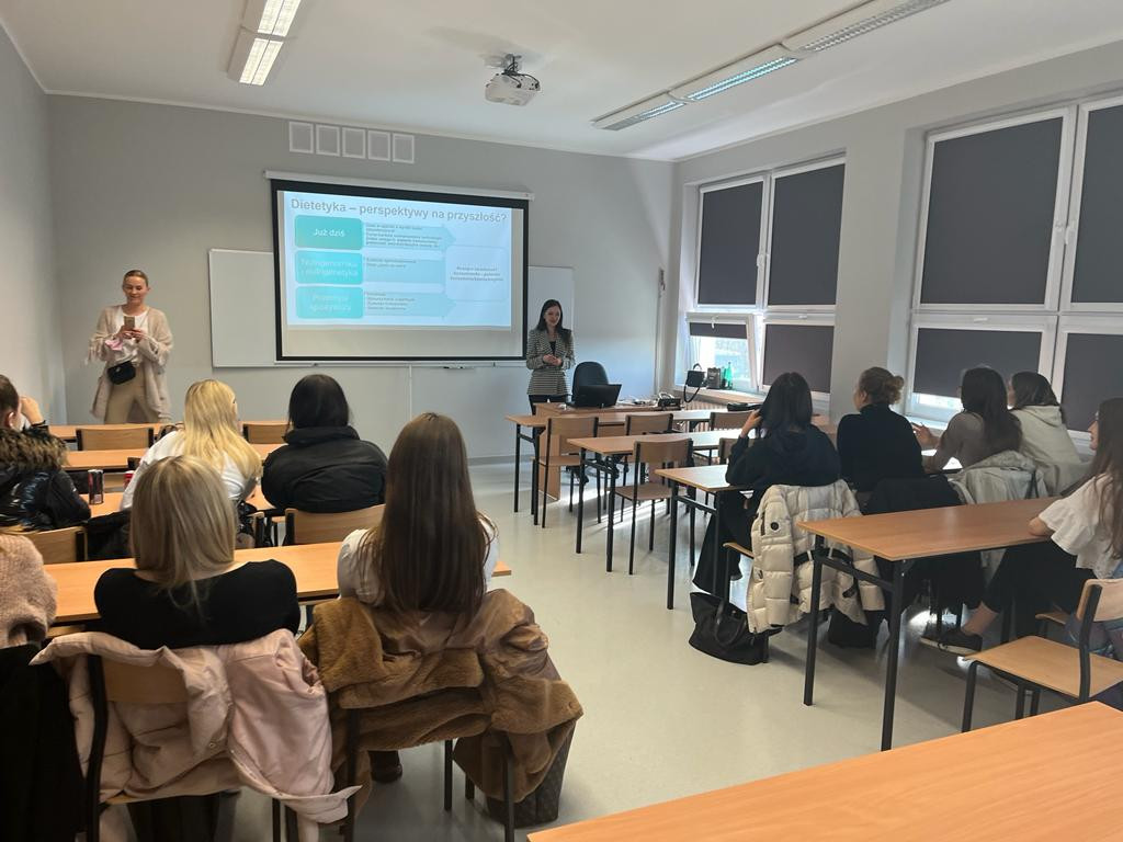 Z kolei dr Angelika Kargulewicz przeprowadziła wykład dotyczący roli dietetyka we współczesnym świecie. W trakcie prelekcji uczniowie poznali zadania, jakie stoją przed współczesnym dietetykiem w kontekście edukacji żywieniowej i profilaktyki, tak często obecnie występujących chorób, jak cukrzyca, miażdżyca, czy choroby nowotworowe. Jednocześnie zwrócono uwagę na wielowymiarowość zawodu dietetyka, który może realizować swoje cele zawodowe na wielu płaszczyznach, począwszy od indywidualnej praktyki dietetycznej, prowadzenia komercyjnych wykładów i warsztatów o tematyce żywieniowej, a skończywszy przykładowo na tworzeniu merytorycznych treści na platformy i aplikacje internetowe. Wykład spotkał się z entuzjazmem ze strony młodzieży, która w szczególności była zainteresowana tematyką nowoczesnych diet i ich faktycznym wpływem na szeroko pojęte zdrowie.