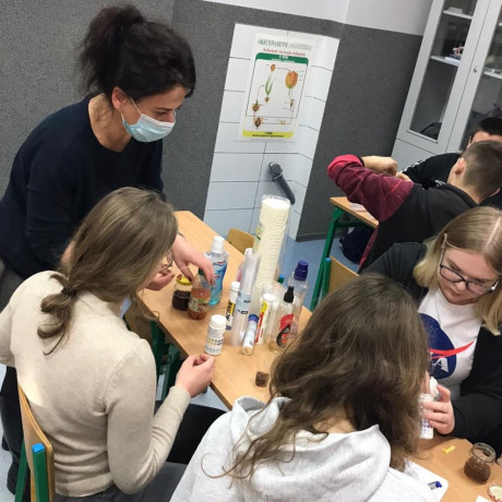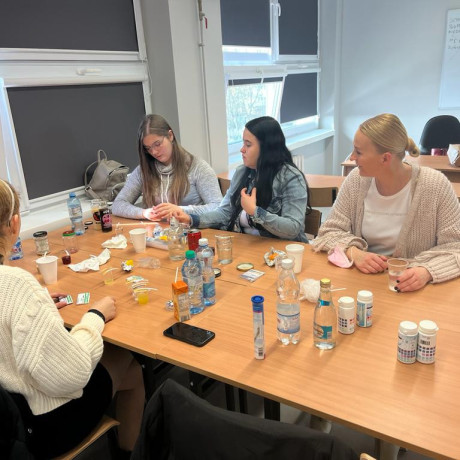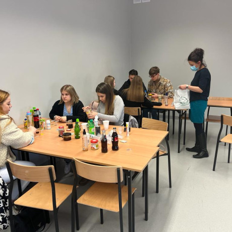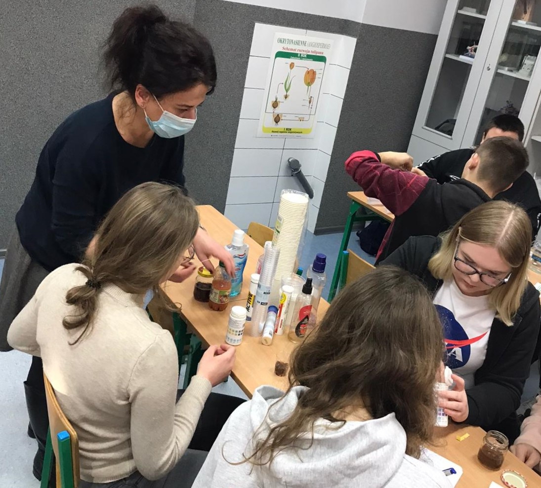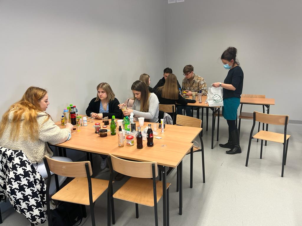 Następnie dr Agnieszka Saran-Jagodzińska zrelizowała zajęcia dotyczące reakcji pH napojów spożywczych, ich działania kwasotwórczego lub alkalizującego na organizm. Podczas zajęć zbadano rożne produkty, m.in. mleko, herbaty, napoje energetyzujące, wody mineralne oraz płyny do płukania jamy ustnej. Omówione zostały także sposoby neutralizowania kwasów w jamie ustnej i zapobiegania erozji zębów.
