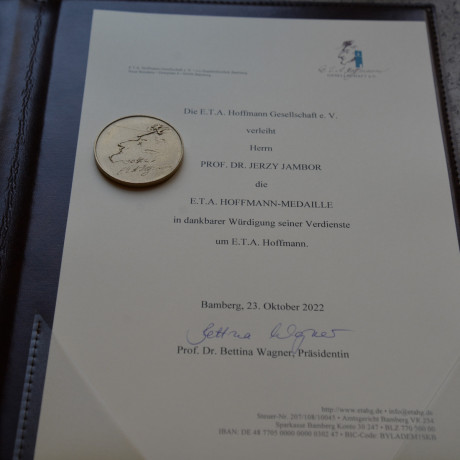 Dr Jerzy Jambor jest dziewiątym laureatem tego medalu, który od 2011 r. przyznawany jest przez Towarzystwo E.T.A. Hoffmanna. Uroczystość odbyła się 23 października 2022 r. w Bambergu.