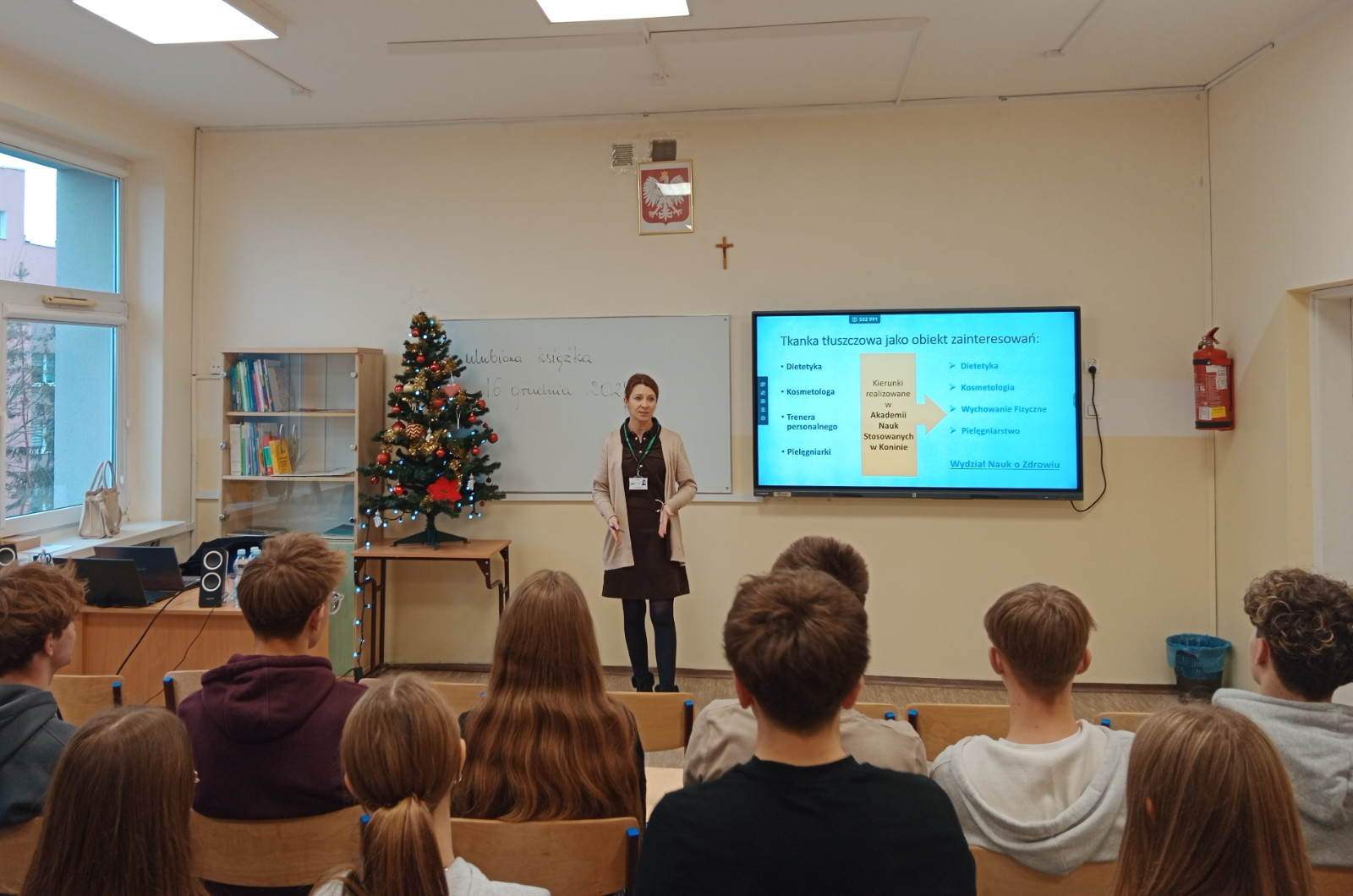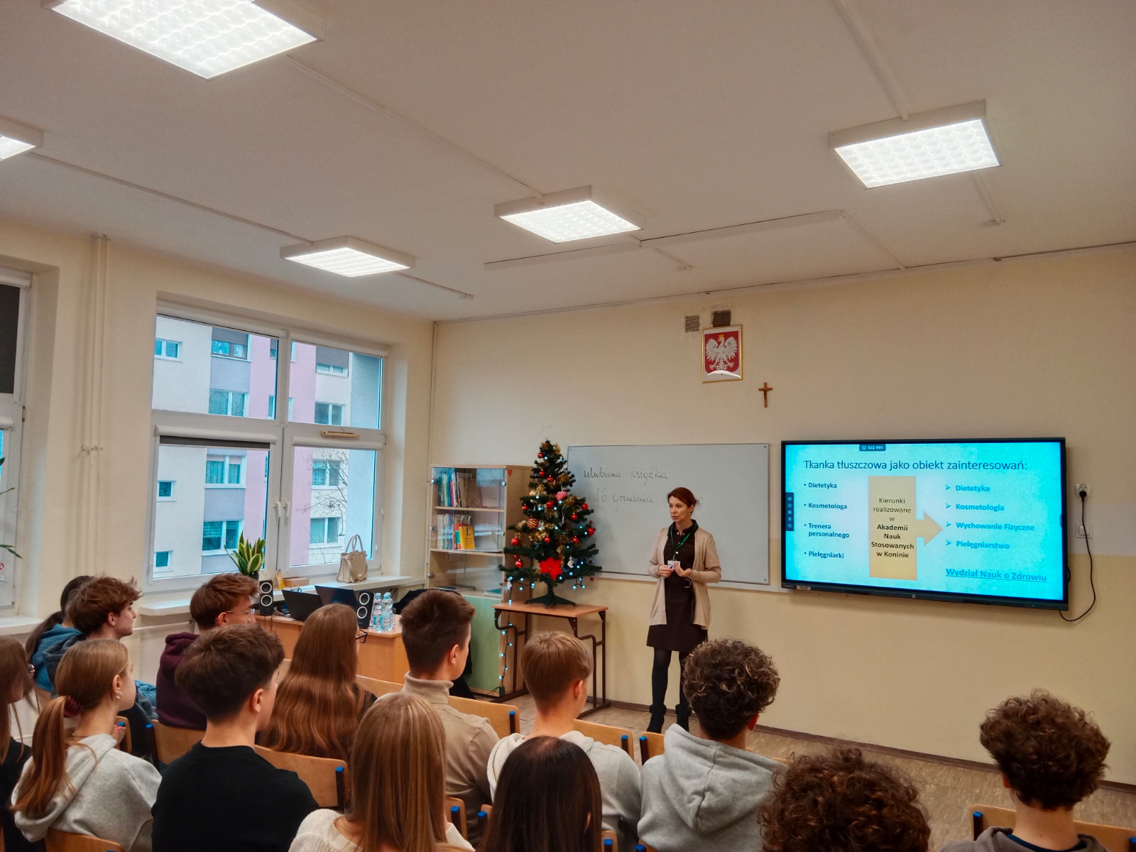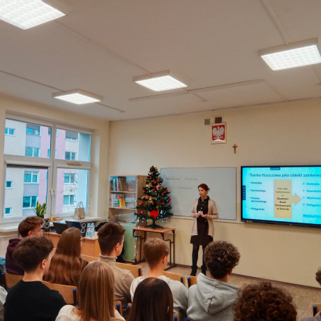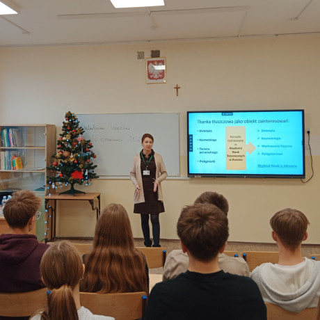I tak dr n. med. Ewelina Drela opowiadała o tkance tłuszczowej jako narządzie endokrynnym. Słuchaczami byli uczniowie klasy o profilu biologiczno-chemicznym, którzy dzięki swojej wiedzy aktywnie włączyli się w zajęcia. Nowością okazała się dla nich informacja o adipokinach, czyli hormonach tkanki tłuszczowej. – To substancje wydzielane przez adipocyty, pełniące różnorodne funkcje – wyjaśniała im dr Drela. Jak mówiła dalej, nadmierna ilość tkanki tłuszczowej prowadzi do nadprodukcji adipokin prozapalnych, prozakrzepowych czy sprzyjających insulinooporności. – Do tej pory młodzi ludzie słyszeli głównie o negatywnej roli tkanki tłuszczowej, jednak od teraz wiedzą, jak ważnym narządem endokrynnym ona jest. Najważniejsze, by pamiętać, że zarówno jej nadmiar, jak i niedobór szkodzi zdrowiu człowieka – dopowiada już po wykładzie, który zakończył się serią pytań od uczestników.