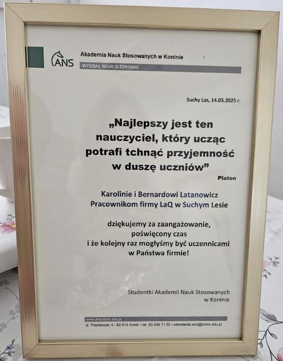 Dr Agnieszka Saran-Jagodzińska, adiunkt na WNZ, która wybrała się ze studentkami do firmy LaQ, podkreśla serdeczną atmosferę, jaką je otoczono. – Dziewczyny na pewno zapamiętają ten dzień na zawsze – uważa.