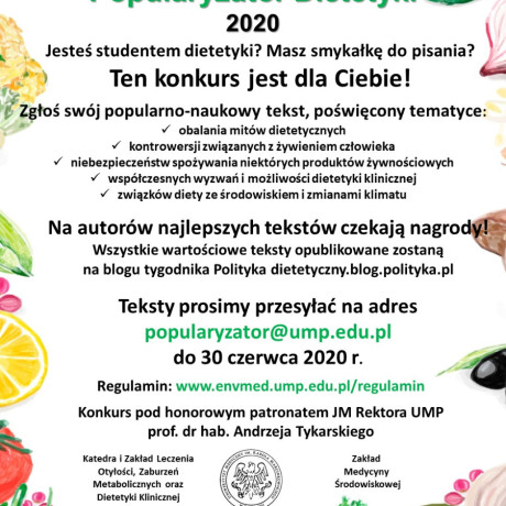 Katedra i Zakład Leczenia Otyłości, Zaburzeń Metabolicznych oraz Dietetyki Klinicznej wraz z Zakładem Medycyny Środowiskowej UM w Poznaniu ogłaszają Ogólnopolski Konkurs „Popularyzator Dietetyki 2020” pod honorowym patronatem JM Rektora prof. dr hab. Andrzeja Tykarskiego.