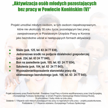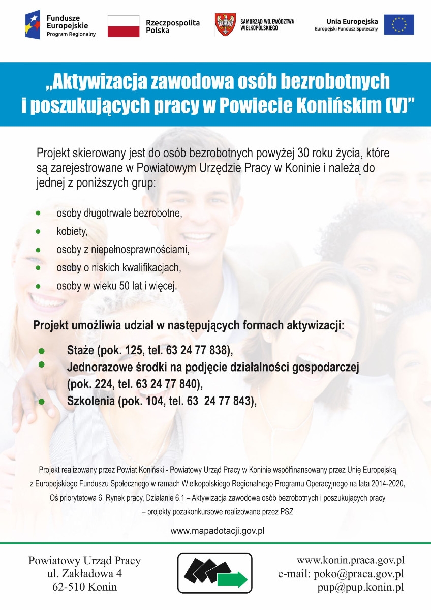 Powiatowy Urząd Pracy w Koninie prowadzi rekrutację do dwóch projektów współfinansowanych z Europejskiego Funduszu Społecznego: „Aktywizacja osób młodych pozostających bez pracy w Powiecie Konińskim (V)” oraz „Aktywizacja zawodowa osób bezrobotnych i poszukujących pracy w Powiecie Konińskim (V)”. Nabory dotyczą następujących form wsparcia: