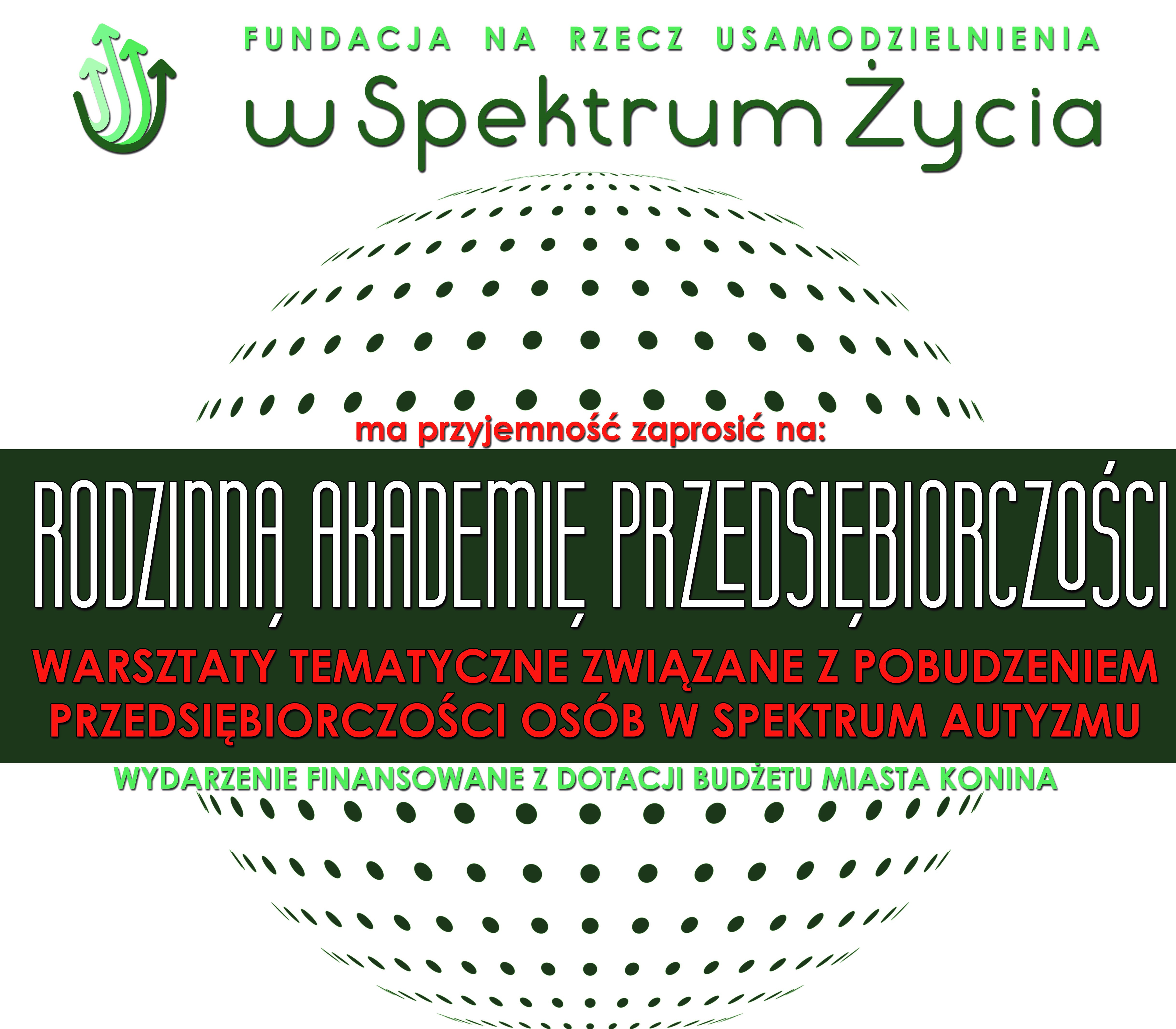 Fundacja w SPEKTRUM ŻYCIA 24 października br. od godz. 9.00 do 15.00 organizuje warsztaty pn. Rodzinna akademia przedsiębiorczości – warsztaty tematyczne związane z pobudzeniem przedsiębiorczości osób ze spektrum autyzmu (ASD w Koninie).