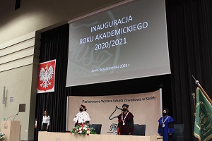 Inauguracja roku akademickiego 2020/2021, która otwiera nową kadencję w PWSZ w Koninie, ze względu na obostrzenia sanitarne odbyła się w Auli im. Jana A.P. Kaczmarka przy wyjątkowo nielicznej widowni. Jednak kto chciał, mógł na żywo obserwować ją na uczelnianym profilu na Facebooku.