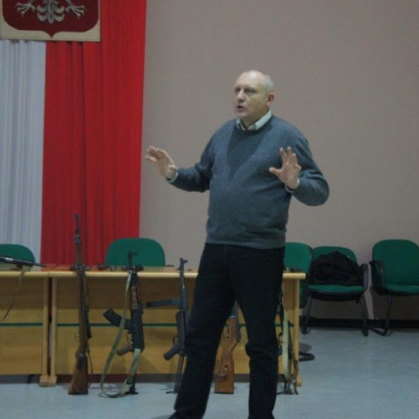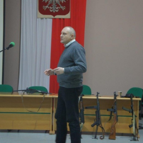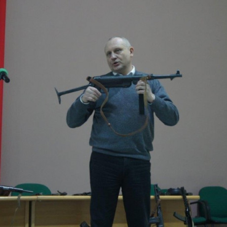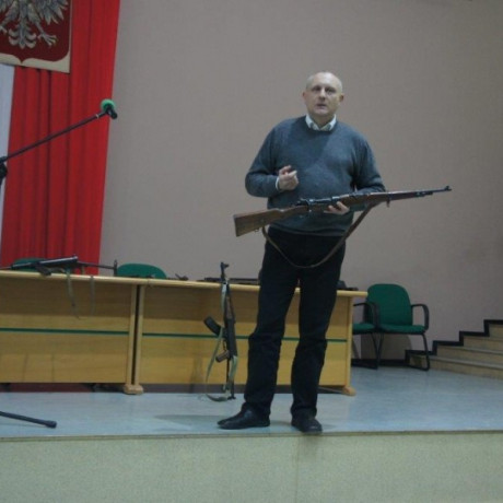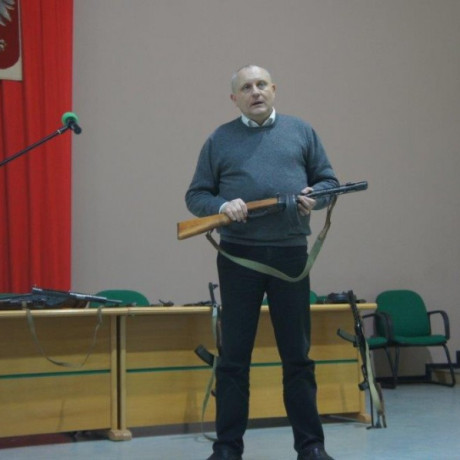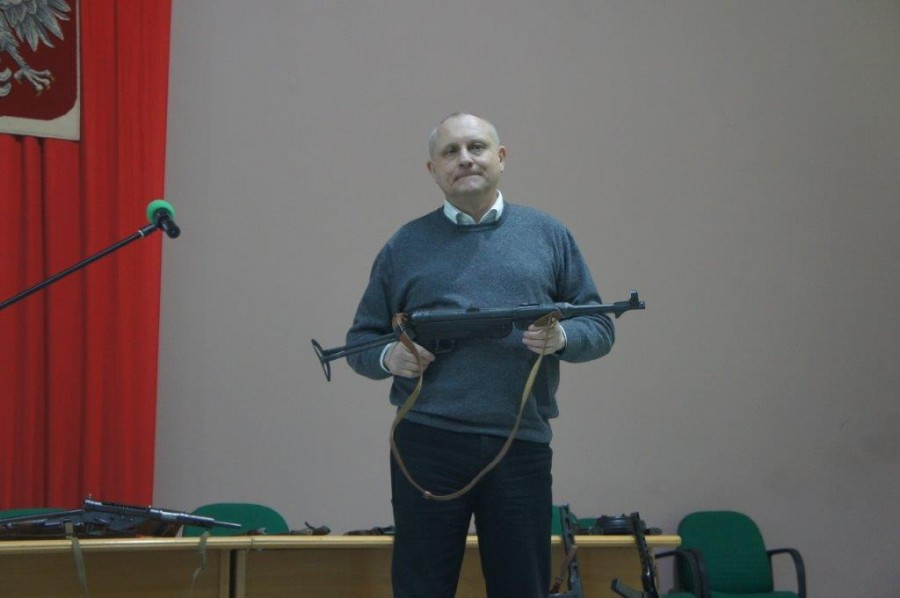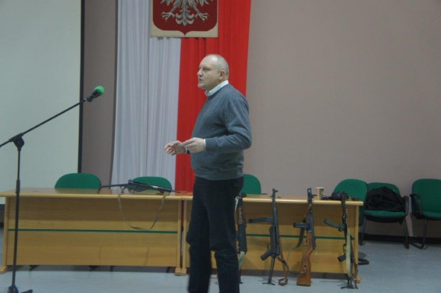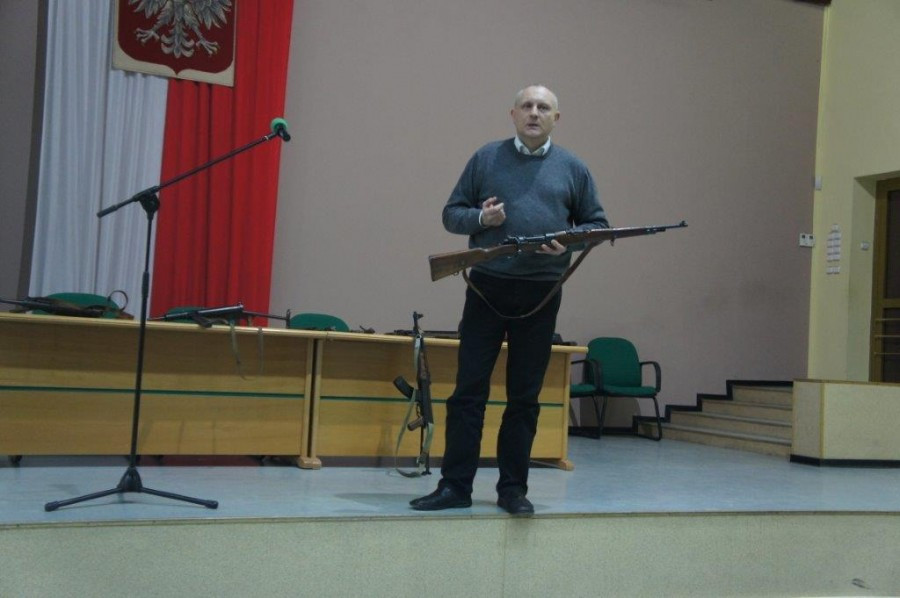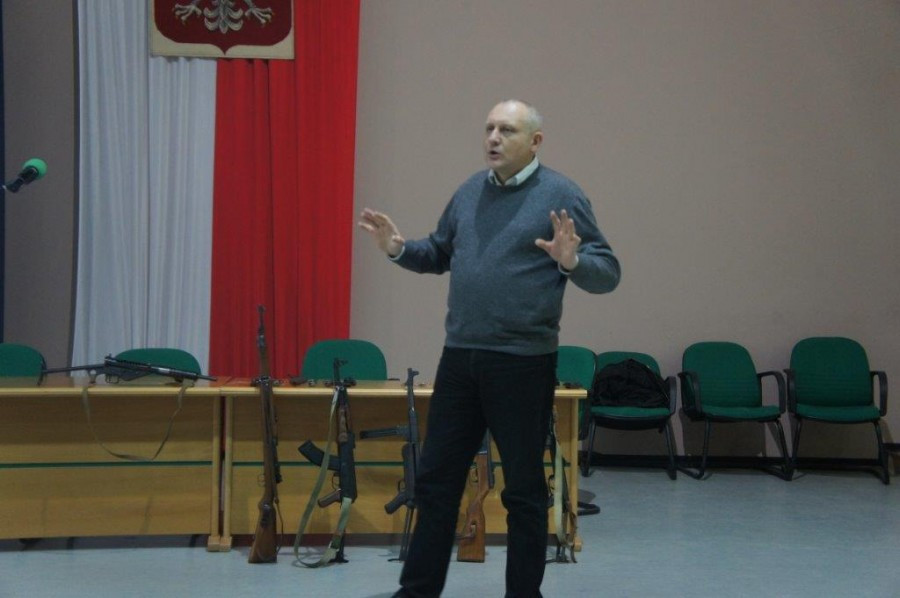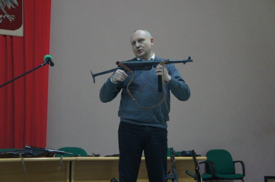 Trzeci wykład tego spotkania AMS, dr. Ireneusza Dziubka, wypełniła barwna opowieść o wszystkich najważniejszych pistoletach maszynowych okresu II wojny światowej, czyli jak wyjaśnił prelegent – czasów „Czasu honoru”. Generalnie prelekcja służyła ukazaniu pomysłowości konstruktorów broni w podnoszeniu ich skuteczności, poręczności oraz zmniejszaniu rozmiarów, by ostatecznie skonstruować broń łączącą wielostrzałowość pistoletu maszynowego i celność karabinu. Towarzyszył temu monologowi pokaz historycznych modeli broni, pozbawionych cech bojowych, czyli niemożliwych do użycia zgodnego z przeznaczeniem. Wszystkie są własnością dr. Dziubka. Najpierw z daleka, a po wykładzie – z bliska, uczniowie mogli więc zobaczyć pepeszę, stena, MP 40 schmeissera, MP 40 mausera, pistolet maszynowy pps, a końcu także kałasznikowa – na wiele dekad niekwestionowanego „władcę” wojen i wszelkich konfliktów po II wojnie – niezniszczalnego i niezawodnego karabinu maszynowego produkcji radzieckiej.