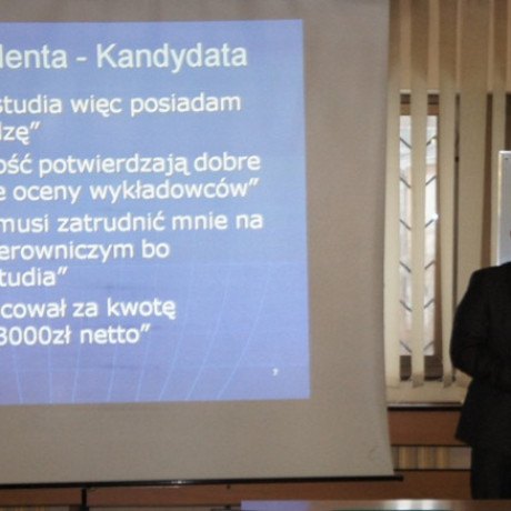 Studenci dowiedzieli się, jak w praktyce przebiega proces rekrutacji i jakich błędów powinni unikać przygotowując swoje dokumenty aplikacyjne. Zobaczyli także jak w rzeczywistości wygląda rynek pracy, postrzegany przez pracodawców. Jak podkreślił prowadzący spotkanie, niestety nadal wśród wchodzących na rynek pracy preferowana jest praca w tradycyjnym wymiarze pełnego etatu, w godzinach od 7 do 15. Wielu pracodawców oczekuje jednak elastyczności co do godzin pracy czy formy zatrudnienia, zwłaszcza na początku współpracy.