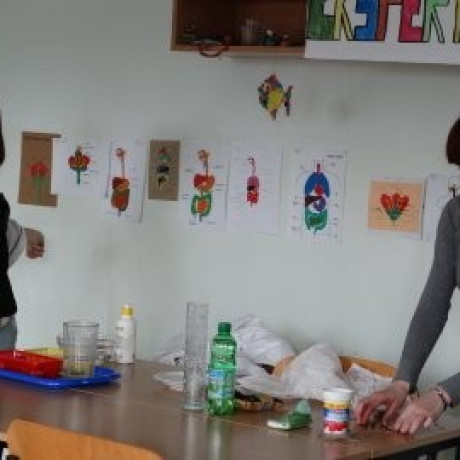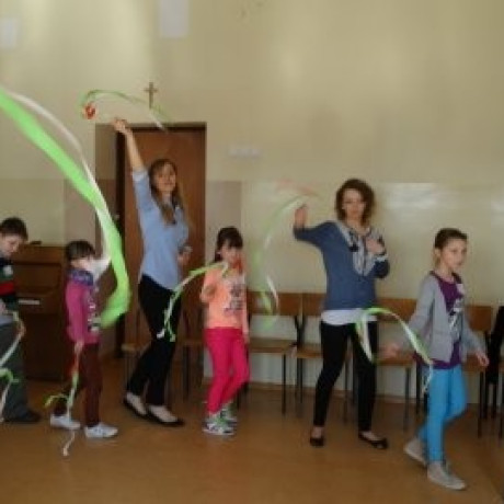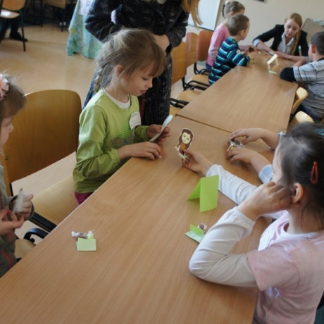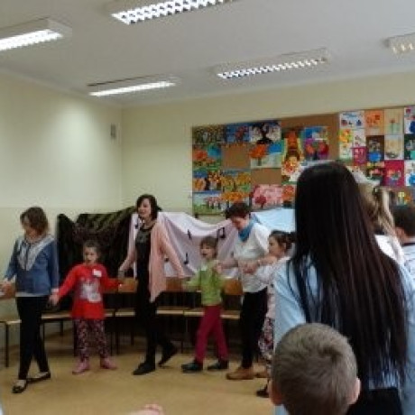 Dzieci, podzielone na trzy grupy, brały rotacyjnie udział w trzech rodzajach zajęć. Artystyczne, czyli muzyczno-ruchowe, polegały na nauce piosenki o wiośnie i kukułce. Przyrodnicze to była poważna zabawa w młodych naukowców, czyli obserwacja i werbalny opis kolejnych etapów rozwoju żaby. Trzecie zajęcia – językowo-literackie – miały usprawniać język. Świetnie nadawała się do tego zabawa w „Czyje to buty?”. Dzieci oddały po jednym bucie, potem jedno z nich opowiadało o wybranym, a pozostałe z zawiązanymi oczami miały rozpoznać o czyim bucie mowa. Maluchy wysłuchały również tekstu dziewczynki, która dziękowała za okazaną jej pomoc, po czym same wymyślały, jak można jeszcze inaczej podziękować. Swoje propozycje inscenizowały. By lepiej wcielać się w różne role, miały do pomocy rekwizyty: krawaty, chustki torebki itd.