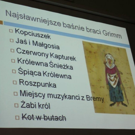 ‒ To jedyny polski przekład, który jest dokładnym odwzorowaniem tego, co napisali Grimmowie ‒ powiedziała w zapowiedzi prelekcji dr Anna Stolarczyk-Gembiak, dziekan Wydziału Filologicznego PWSZ w Koninie. ‒ Poprzednie były znacznie modyfikowane, dostosowane do potrzeb ówczesnych zwyczajów i kanonów wychowawczych ‒ dodała.