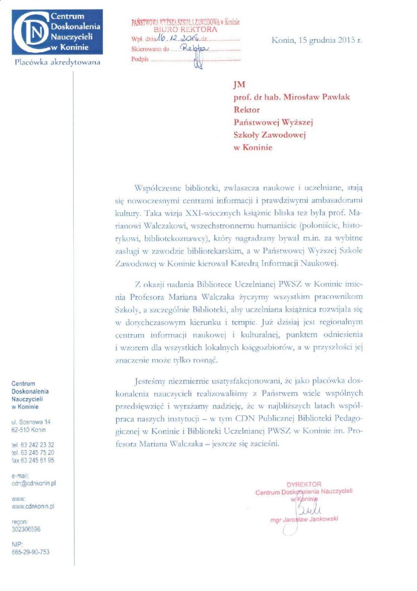 Imię Profesora Mariana Walczaka otrzymała Biblioteka Uczelniana PWSZ w Koninie. Wśród wielu pięknych słów o Nim jako pedagogu, padły kilkakrotnie również takie, który wiele mówią jakim był człowiekiem: – Zawsze umiał powiedzieć właściwą rzecz we właściwym momencie.