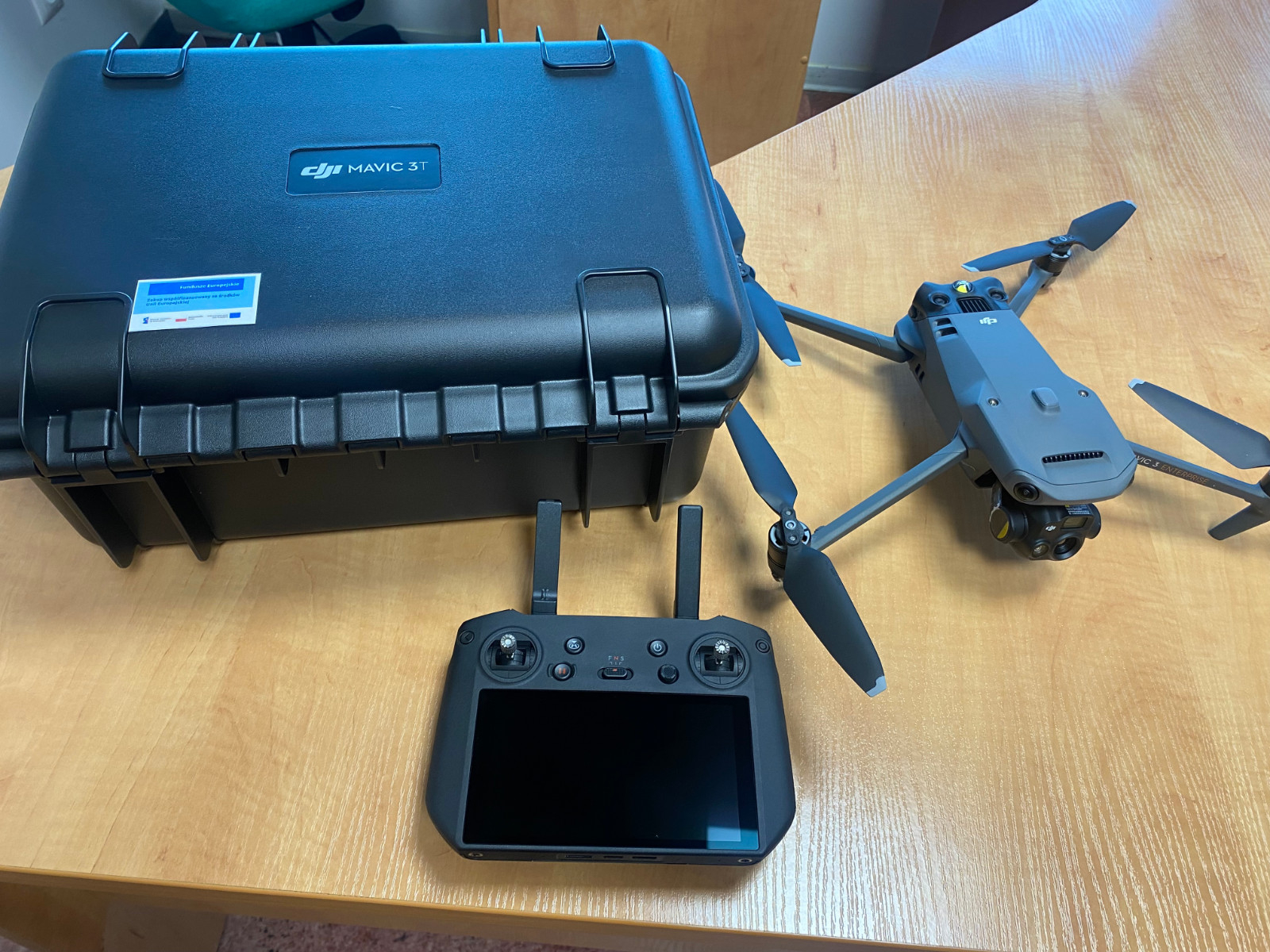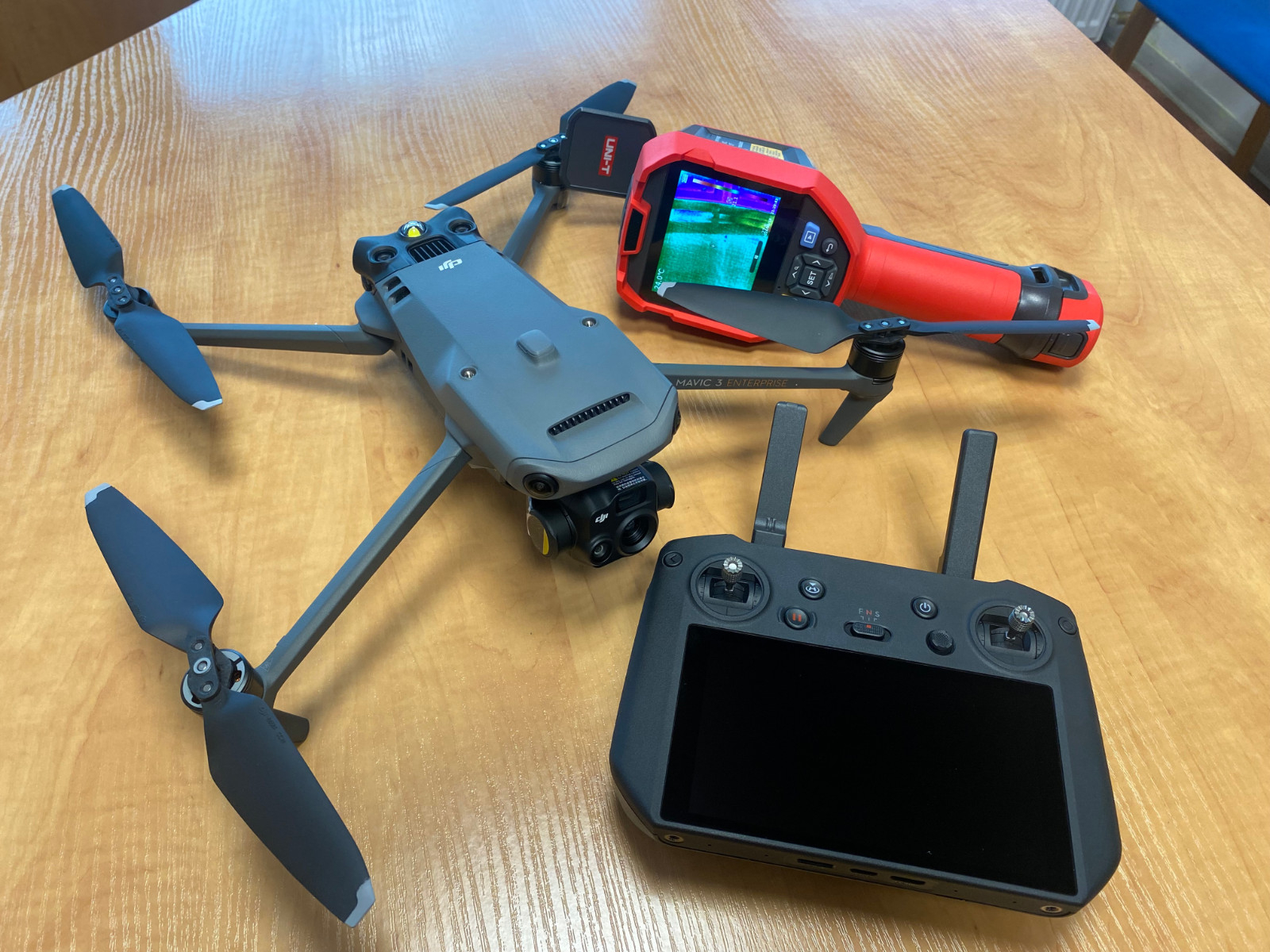 Dron DJI Mavic 3 – to nowoczesne urządzenie wyposażone w dwie kamery światła dziennego oraz kamerę termowizyjną. Ma zaawansowany system RTK (real-time kinematictechnologia dokładnych pomiarów przy użyciu nawigacji satelitarnej) i funkcję wykrywania przeszkód, co umożliwia wyjątkowo precyzyjne loty. Dron pozwala na tworzenie wysokiej jakości zdjęć i nagrań z powietrza, idealnych do zastosowań profesjonalnych i technicznych.